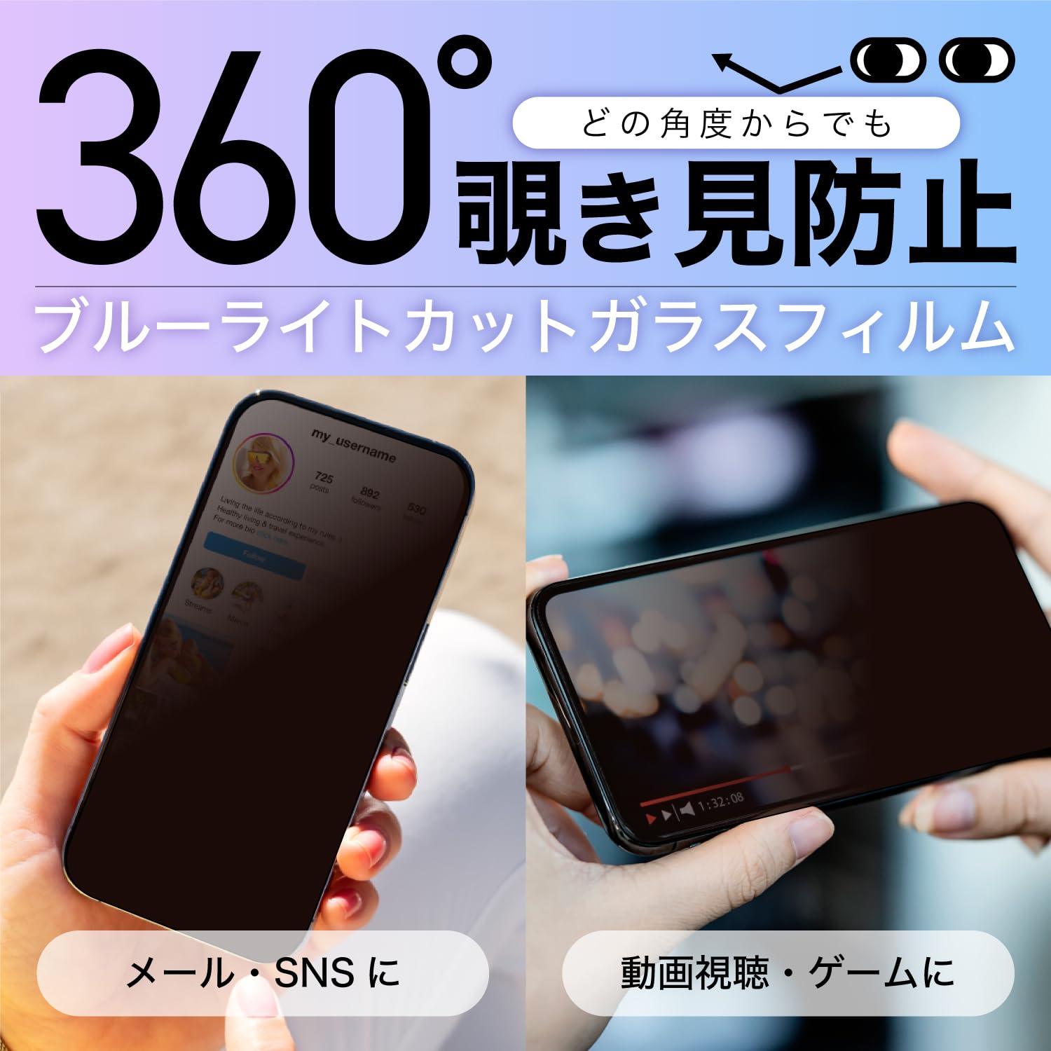 【 360度 のぞき見防止機能 】 縦持ち・横持ち両対応!どの角度からでも覗き見を防止します。電車などでも安心のプライバシー保護フィルムです。※画面を使用したバーコード決済などは、画面を明るくしてご使用ください。