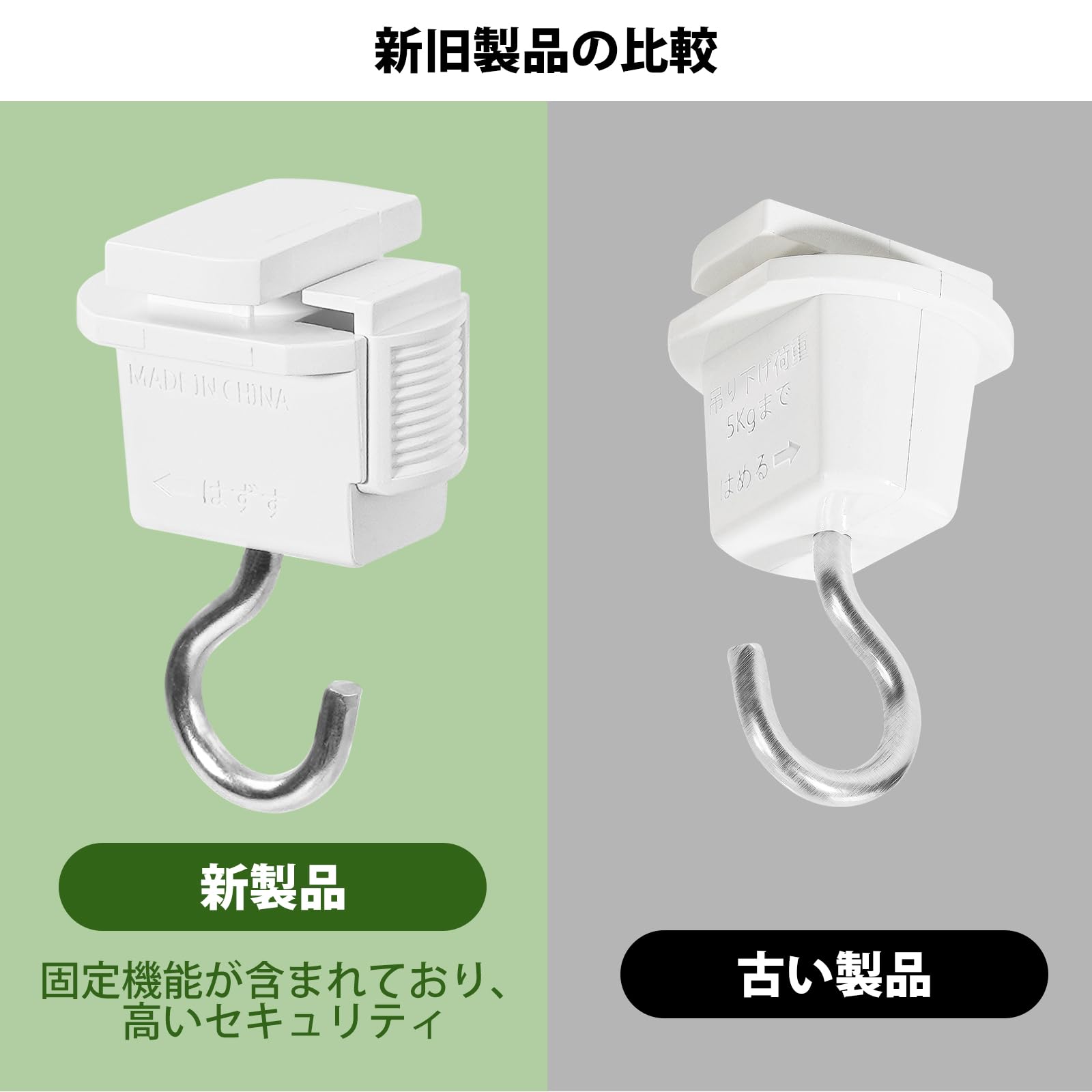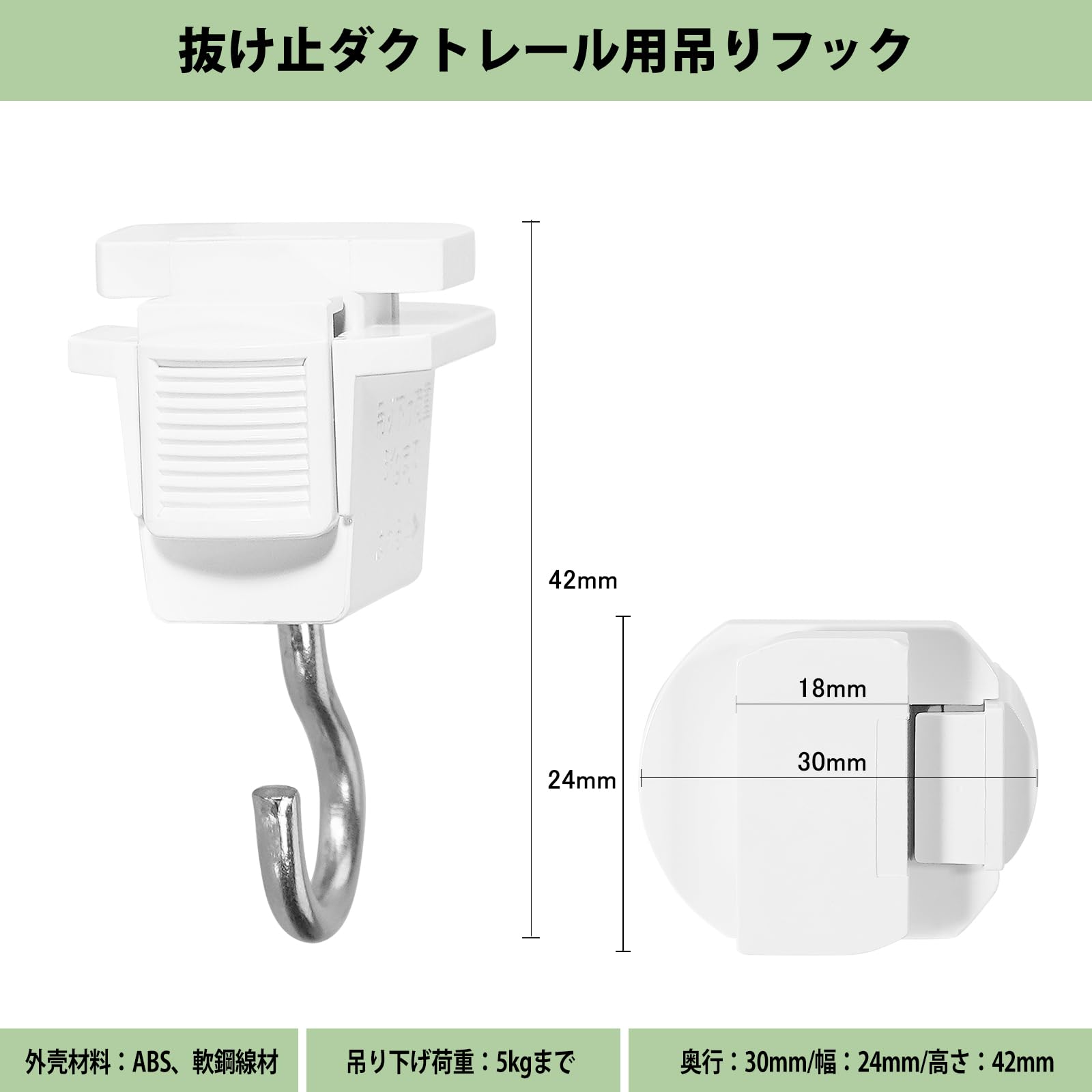 1、【仕様】商品名: 抜け止ダクトレール用吊りフック 色:ホワイト 重量:13g/1個 材質: ABS、軟鋼線材 吊り下げ荷重:5kgまで 奥行:30mm/幅:24mm/高さ:46mm 期間:1年