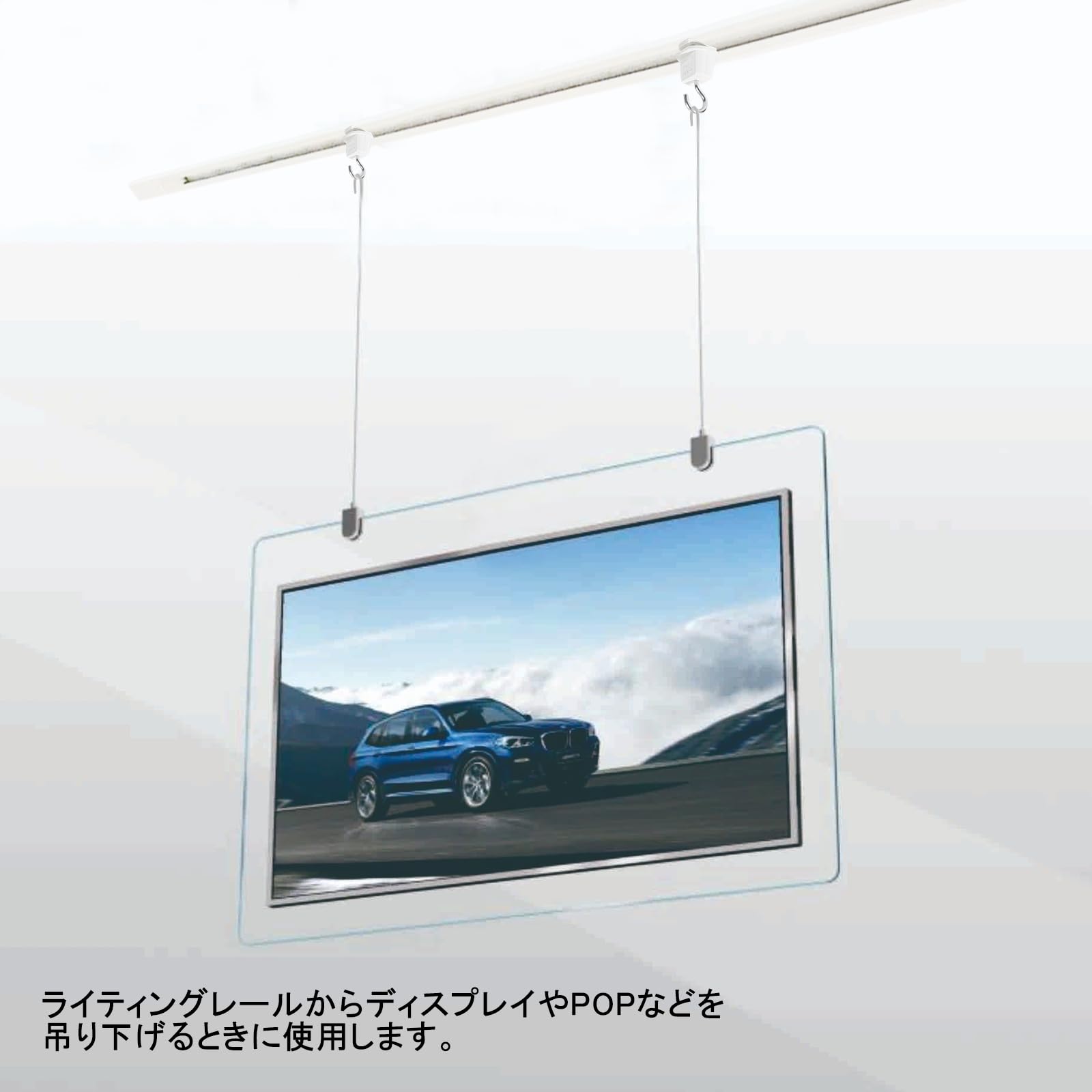 4、【特長】ライティングレールからディスプレイやPOPなどを吊り下げるときに使用します。