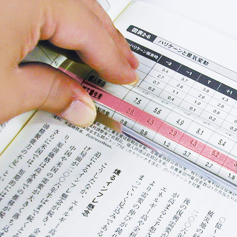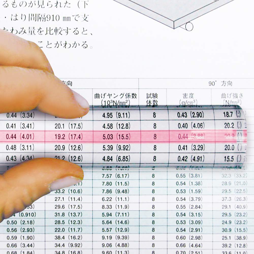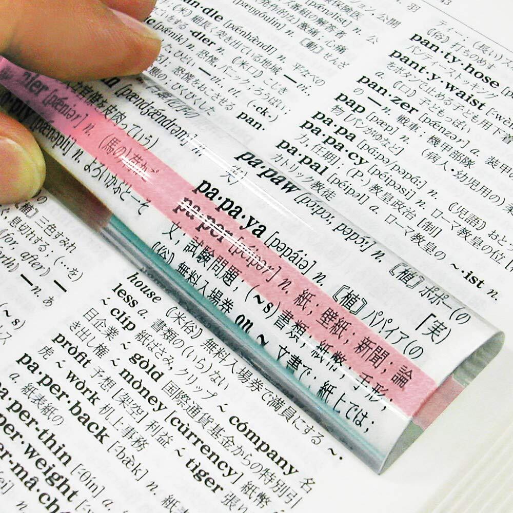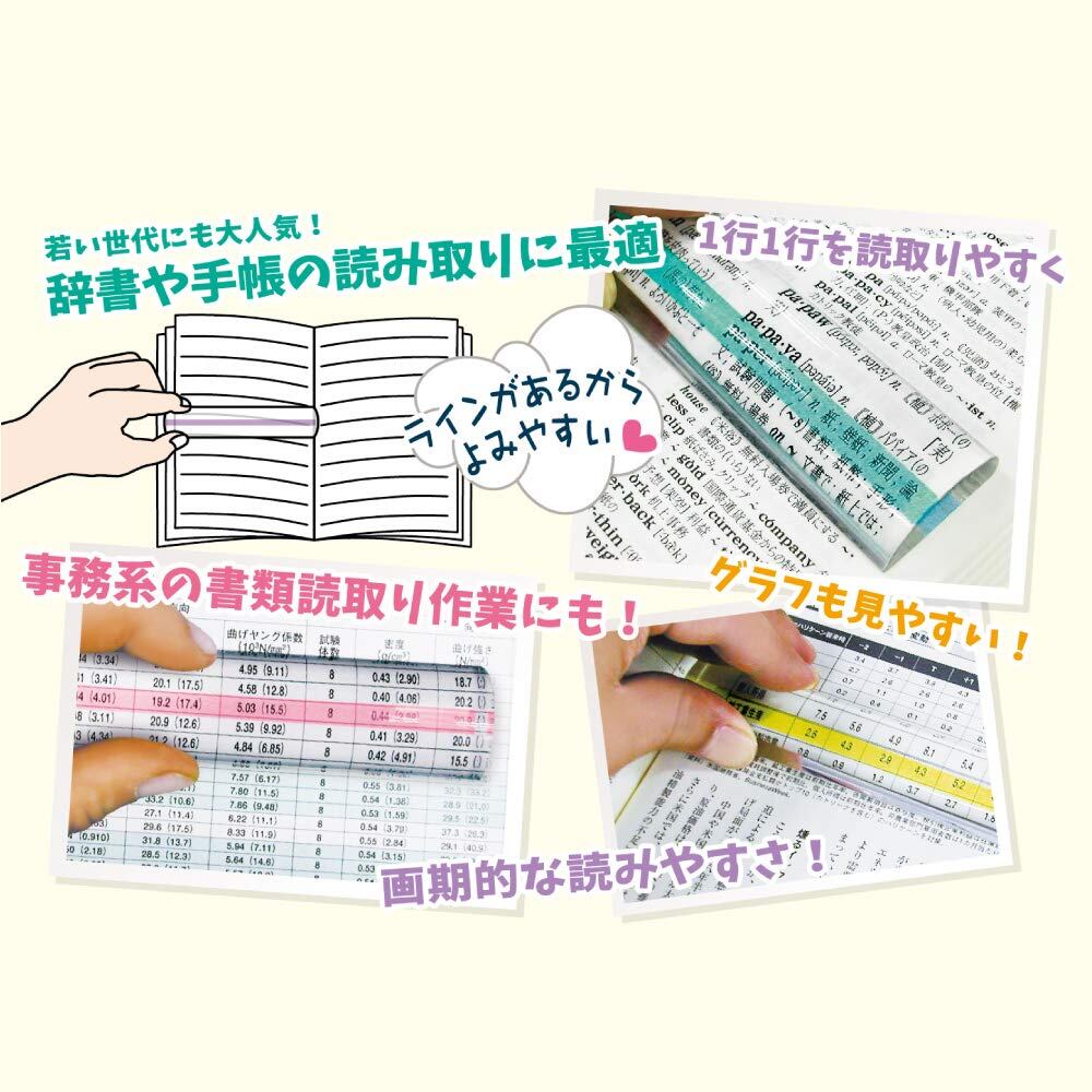 こんなのほしかった! の声から誕生した画期的な読みやすさのルーペです。 ●センターのカラーラインと文字を重ねることで瞬時に読取ることができる。 ● 一行一行を読取り易くし、さらに文字の大きさも2倍に拡大。 今まで分かり辛かった行の読取りがストレスなくスムーズになります。 ●行読みのばらつきを防ぎ、長時間の読取り作業でも目が疲れにくくなります。 ●通常の文章読取りはもちろん、事務書類の読取りや実験グラフなどの読取りにも。 ●使わない時はデスクに置いてペーパーウェイトとしてもご利用いただけます。 ●ライトラベンダー・ライトグリーン・ライトピンク・ライトイエローの4色展開。