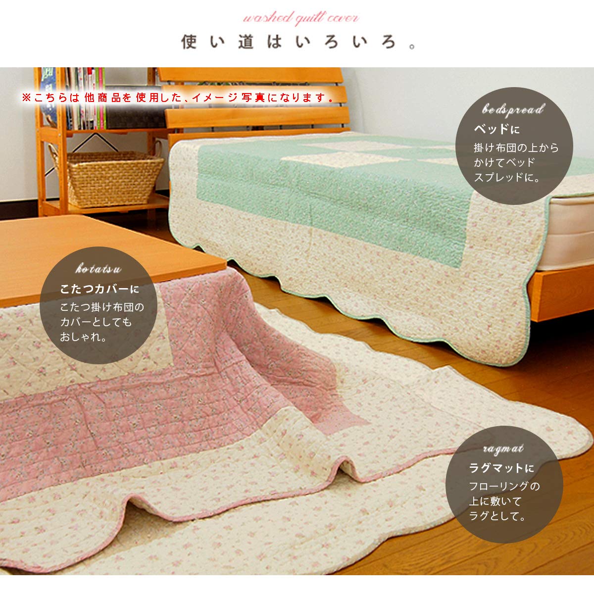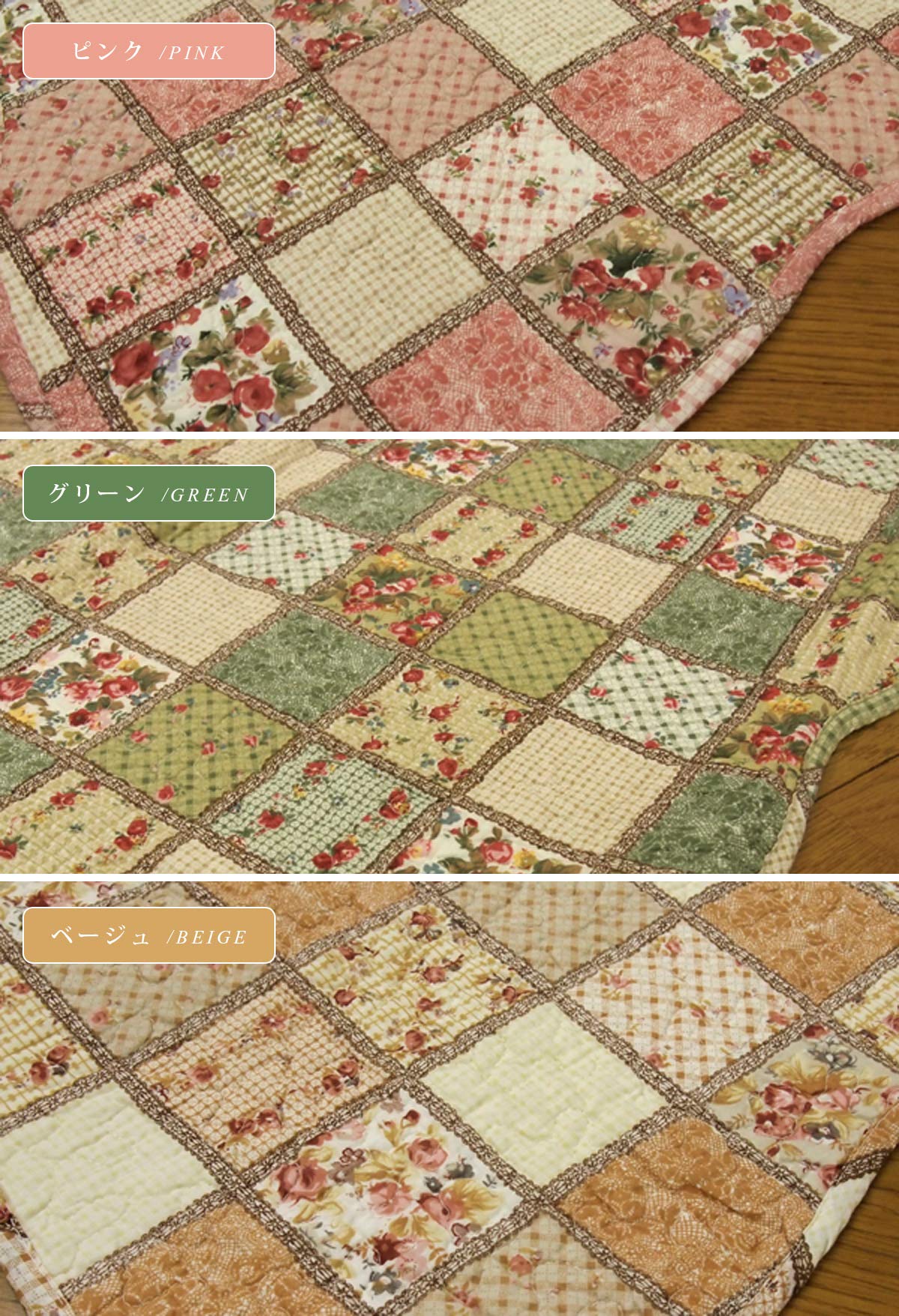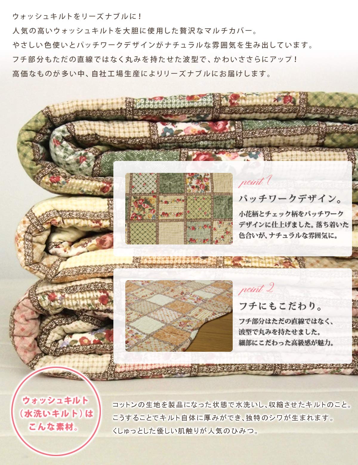 やさしい肌ざわりで人気のウォッシュキルトマルチカバー。小花柄とチェック柄のパッチワーク風デザイン、ふち部分は丸みを持たせた波型でナチュラルなかわいさを演出します。コットン生地を水洗い加工することで肌ざわりが優しく風合いも良くなるのが、ウォッシュキルト(水洗いキルト)の人気の秘密です。