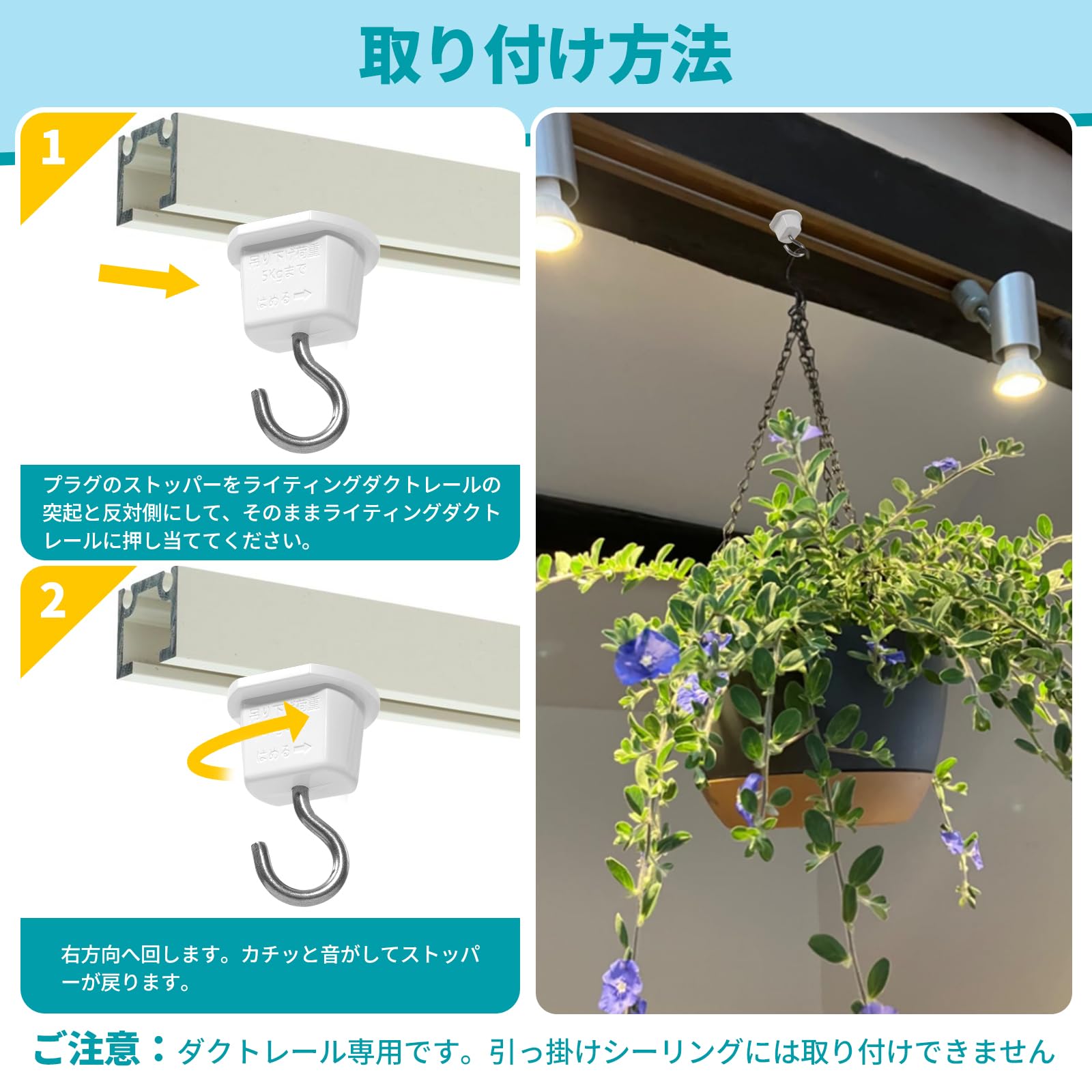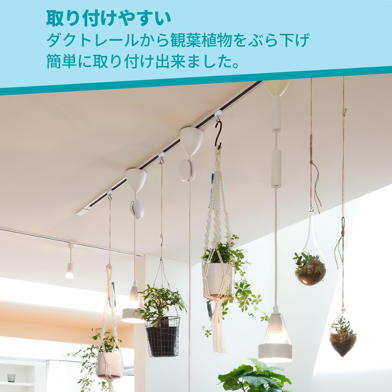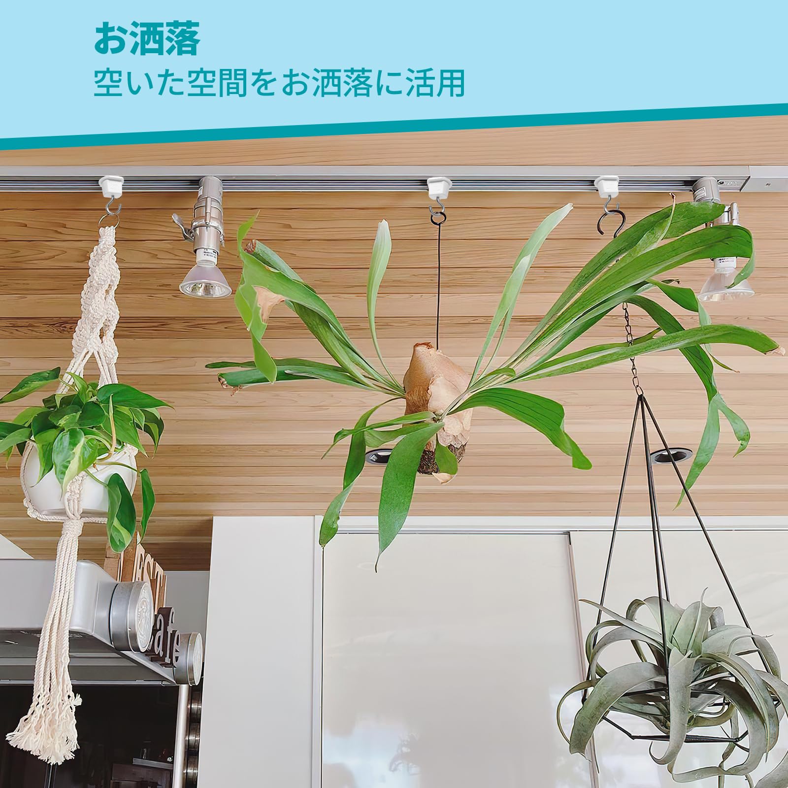 2、【特長】ダクトレールにはめて半回転させるだけなのでとても簡単に設置できます。ドライフラワーのスワッグなど軽いものを引っ掛けるのに使用しています。フックがあると色々アレンジできますし、フックにグリーンを飾ると部屋の雰囲気も変わってなかなか良いですね。