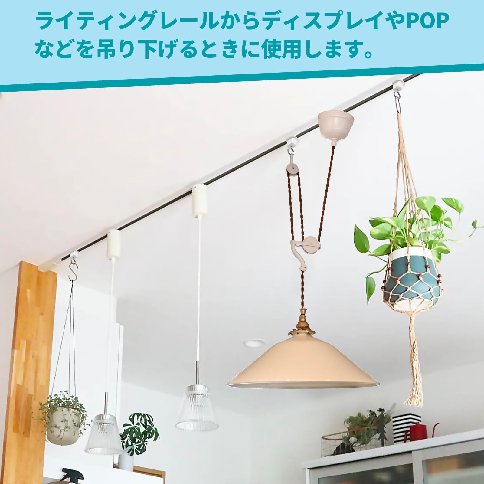 1、【仕様】ライティングレールからディスプレイやPOPなどを吊り下げるときに使用します。 色:ホワイト 重量:12g 材質: ABS、軟鋼線材 吊り下げ荷重:5kgまで 奥行:27mm/幅:24mm/高さ:46mm 期間:1年
