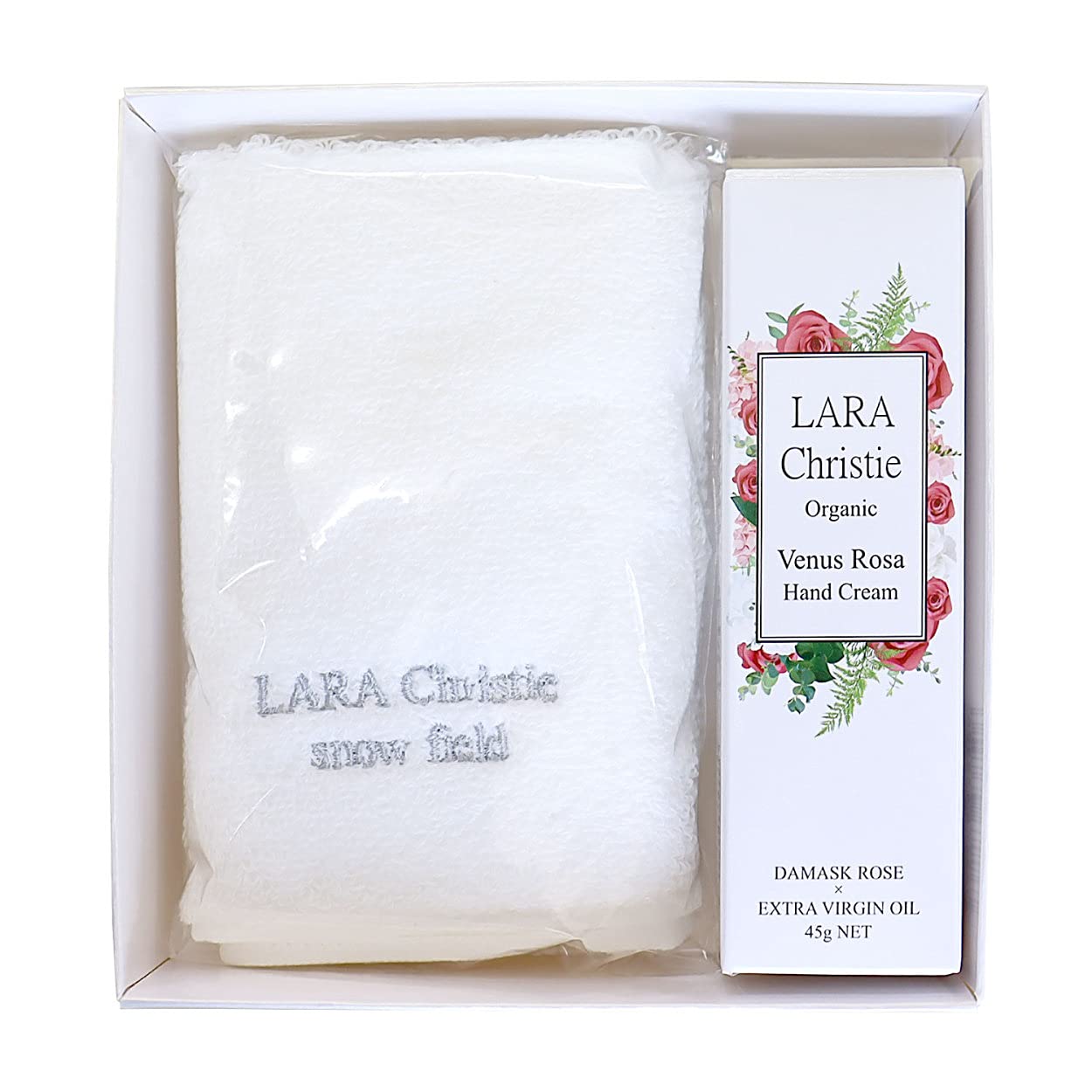 満足の使い心地と、新雪のようにふわふわな今治タオルを使用したコットンタオル「snowfield」と、優しいローズの香りとオーガニック成分にこだわったハンドクリーム「ヴィーナスローザVenusRosa」、LARAChristieのスタイルコレクションで人気の高い2アイテムを、専用のギフトボックスに入れてお届けします。