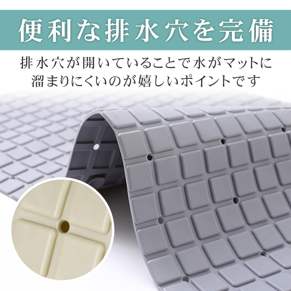 表面はフラットではなくマス目が浮き上がったデザインにより、グリップ力が高まるので転倒を防ぎます。マットには排水穴が開いていることで、水がマットに溜まりにくい仕様です。