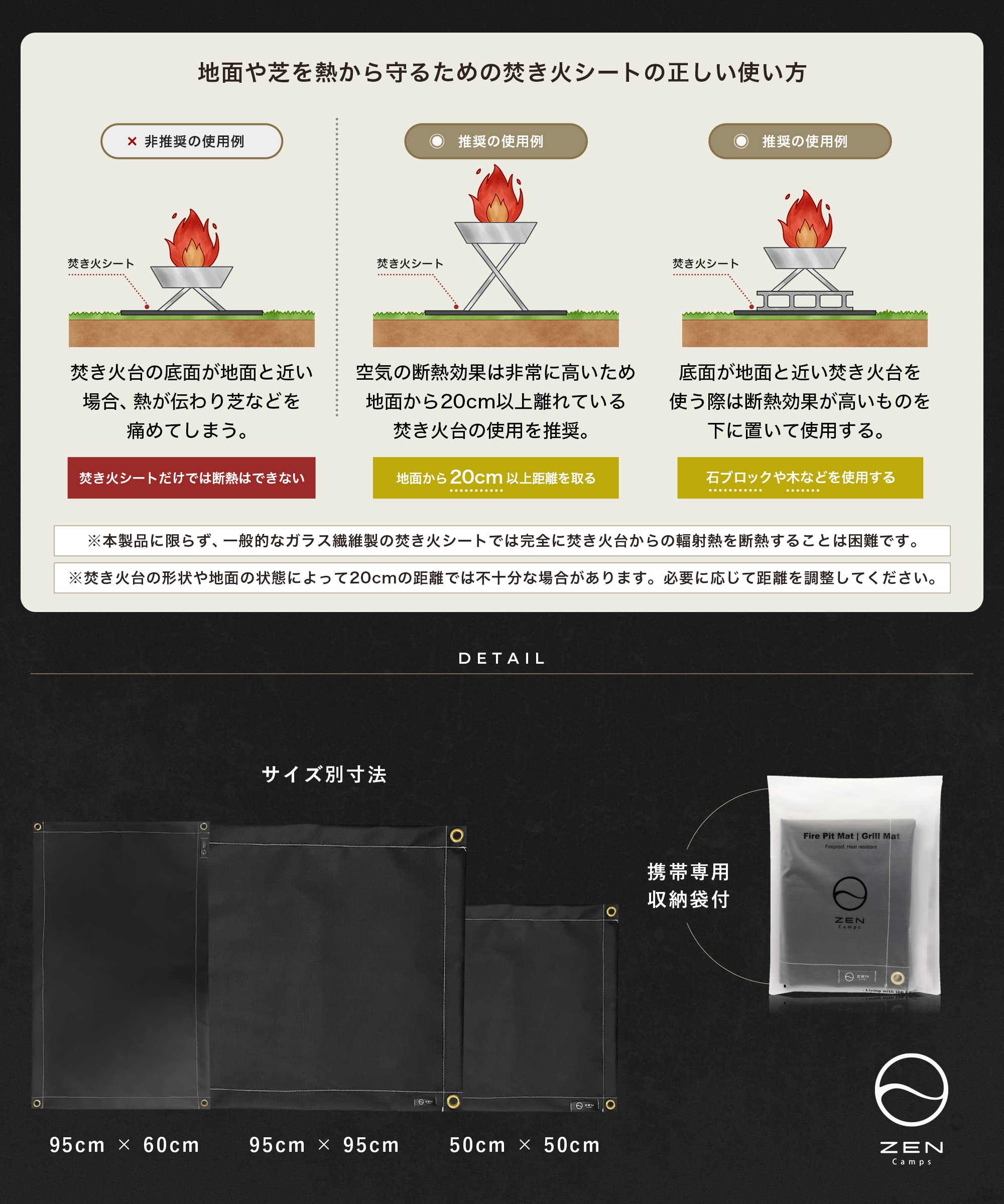 【注意事項】:本シートは耐火・耐熱シートであり、断熱シートではありません。シート上に高温なものがあるとシート越しに地面に熱が伝わる恐れがあります。飛び火からの延焼を防ぐ道具とご理解ください。一般的にガラス繊維製の焚き火シートは飛び火による瞬間的な熱から地面を守り、延焼を防ぎますが、焚き火台からの継続的な輻射熱は地面に伝わります。地面や芝を守るために、火床と地面を離す(20cm以上)、若しくは水に濡らした木等、断熱性のあるものを焚き火台と焚き火シートの間に置いてください。