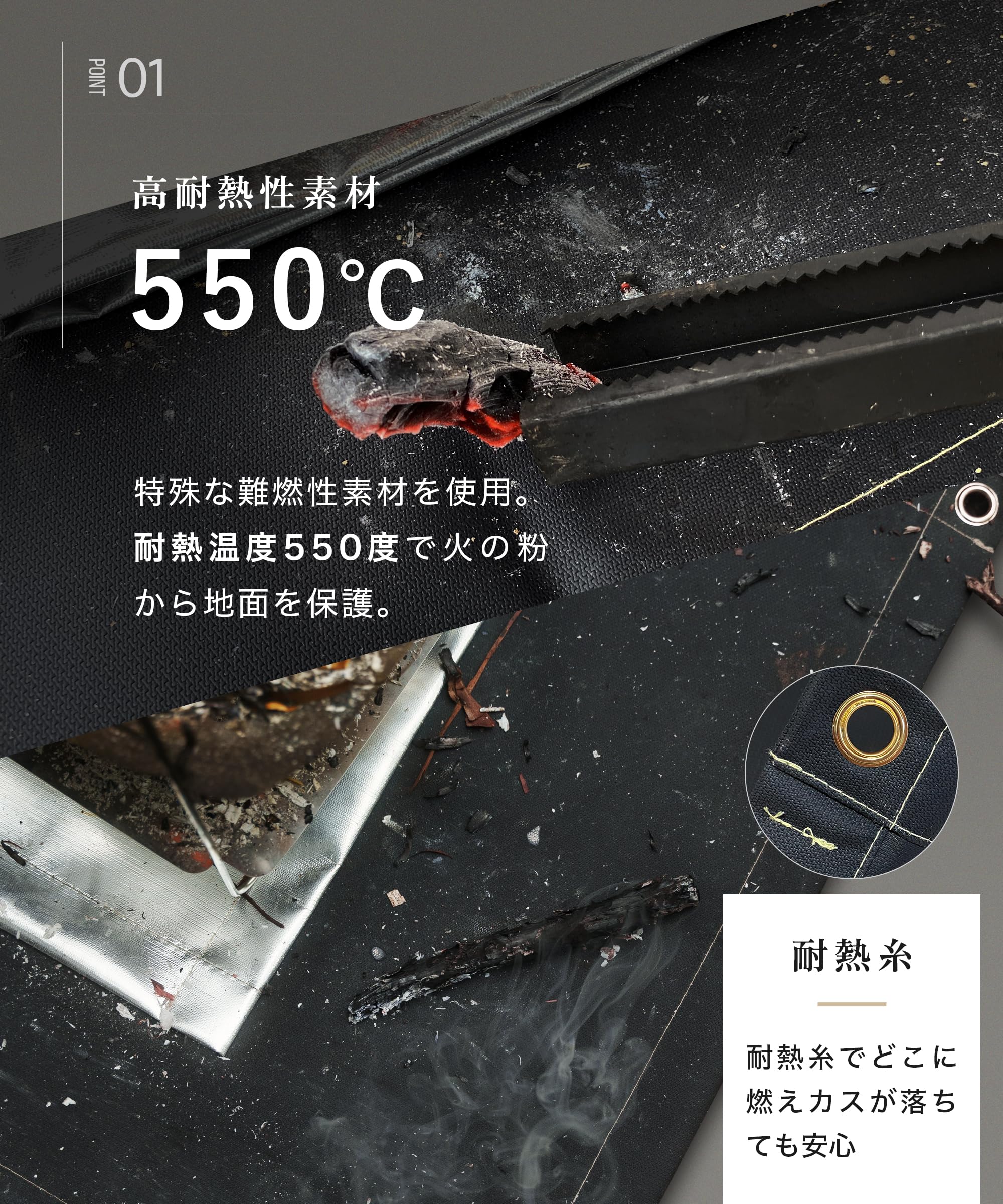 ??ハトメつきなので、風が強い場合にもペグダウンできて安心。ハトメはシートが三重に折り重なっている部分にカシメられており強度が高いです。風が強い場合にもペグダウンできて安心。??焚き火台だけでなく、2つに折って使用すれば卓上バーベキューグリルにも使用できます。ウッドデッキの保護にも最適です。キャンプ、バーベキュー、その他様々なシーンに使えるシートです。大活躍 、どこでも、たき火が楽しめる!火の粉から大地を守る焚き火シートです。