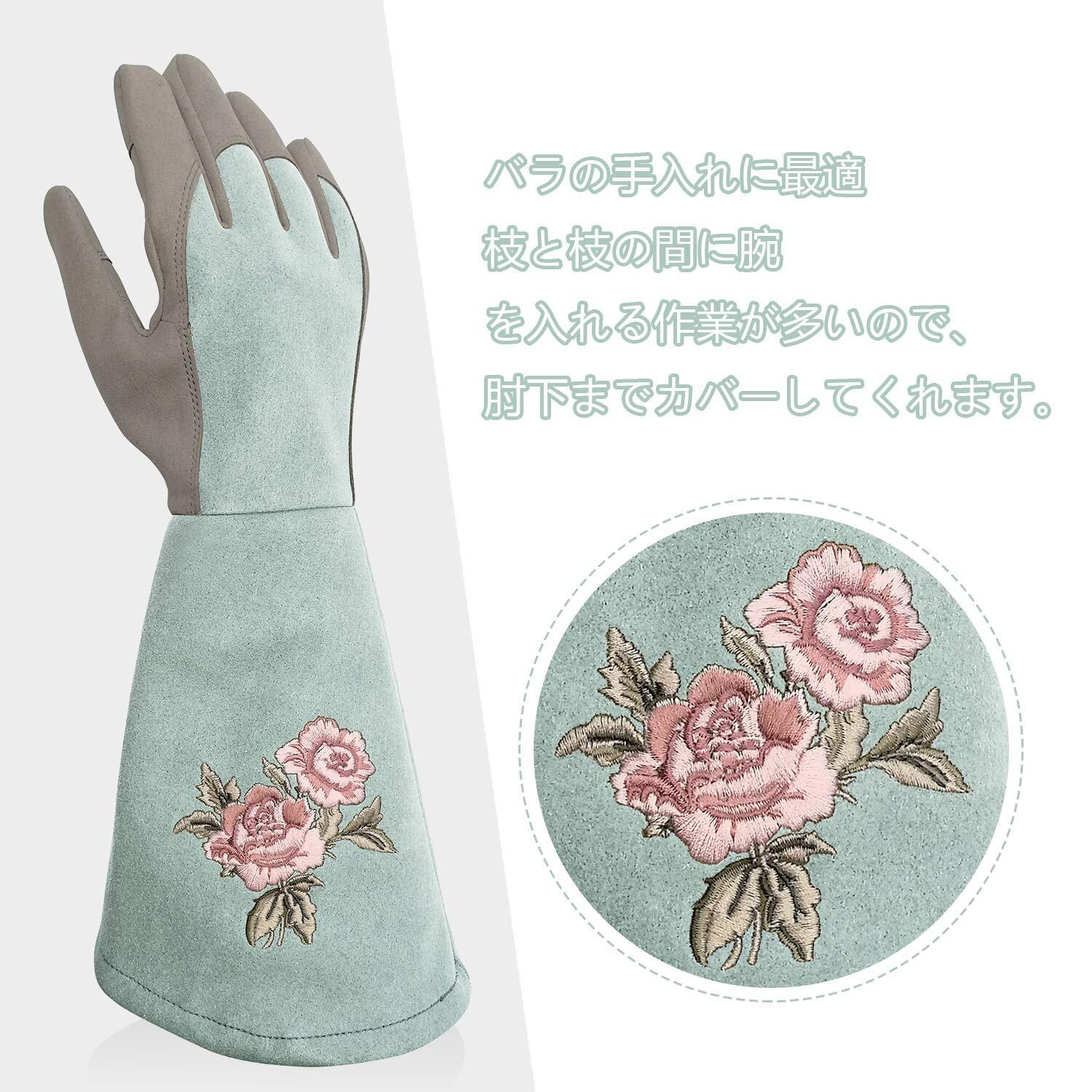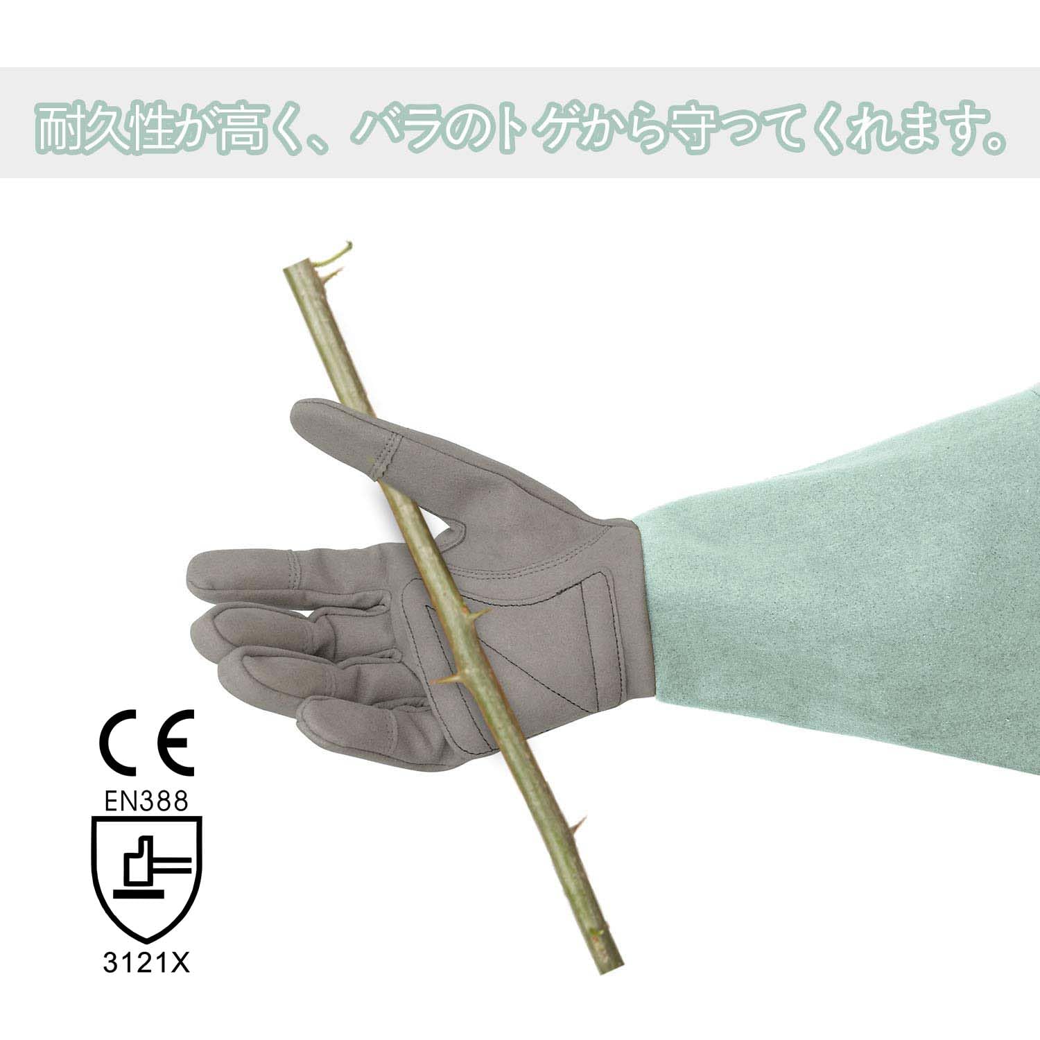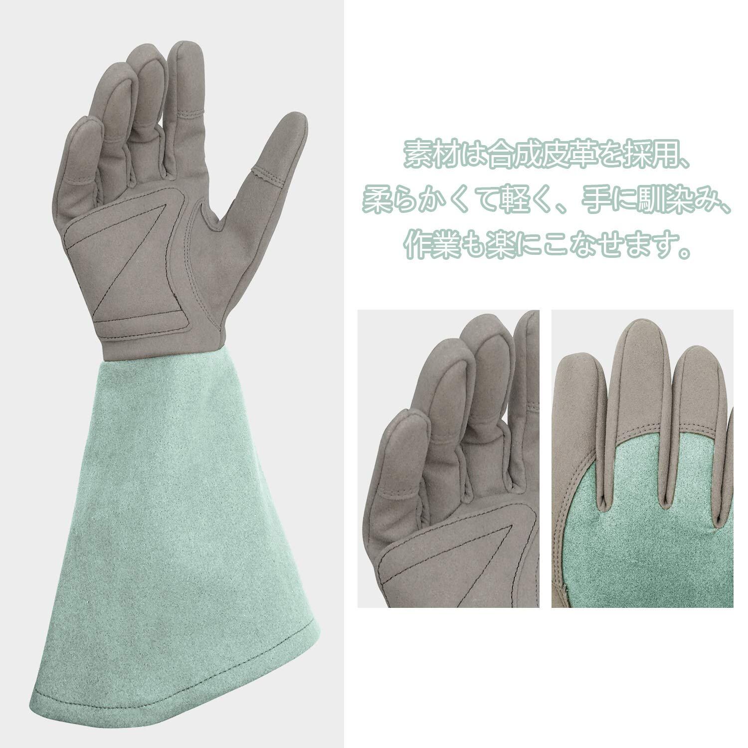 指先と手のひらの部分に合成革が補強され、バラなどの刺や枝の切り口から手を守ってくれます。.全長が35センチ以上の長袖仕様で、腕や肘の部分は刺さりにくいです。