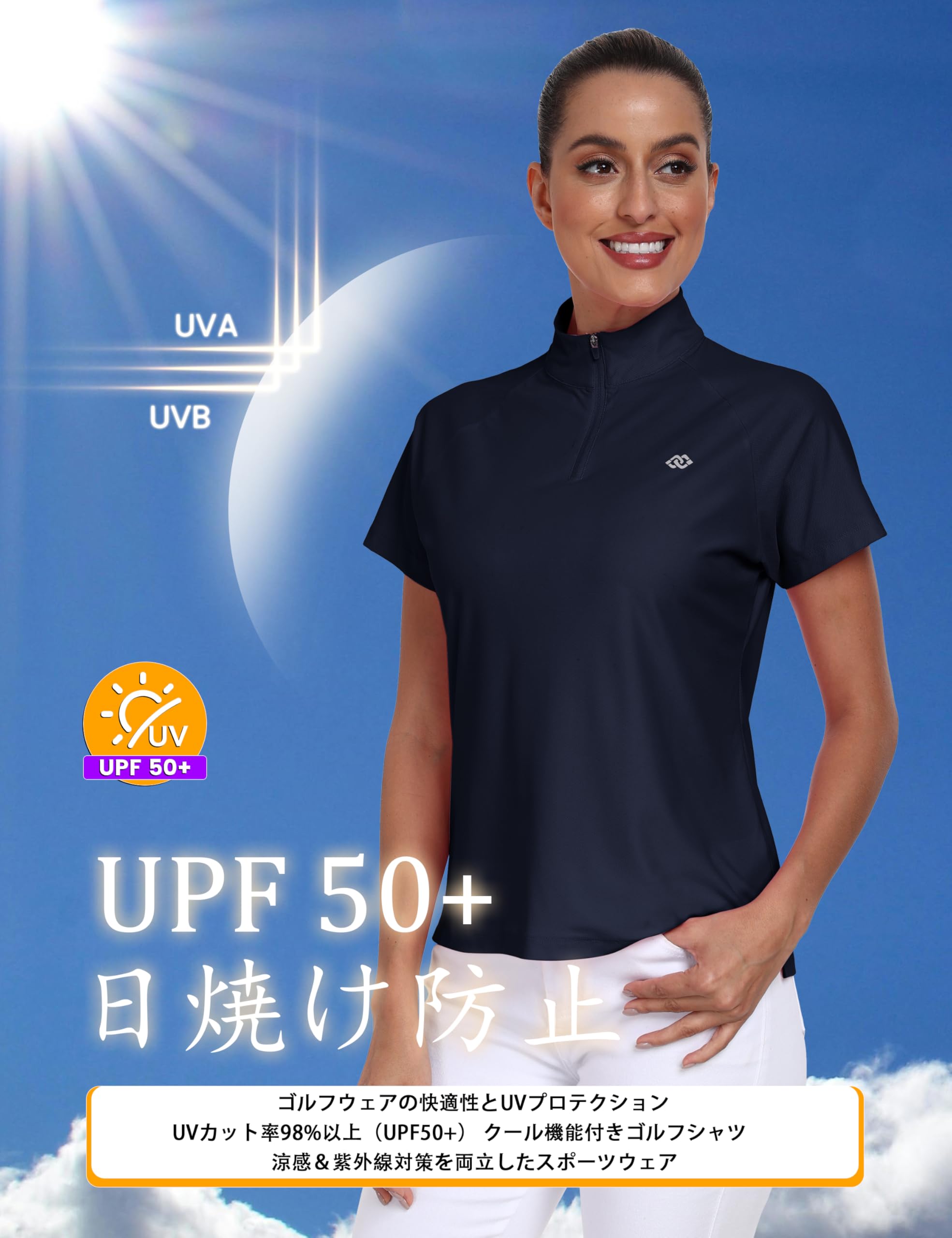 【ハーフジップでスタイルチェンジ可能!】立襟ハーフジップデザインが特徴のレディースポロシャツ。紫外線対策UPF50+仕様で、アウトドアでの日差しから肌を守りつつ、ジップを下ろせばおしゃれな折り襟に早変わり。日常からスポーツまで幅広く活躍!