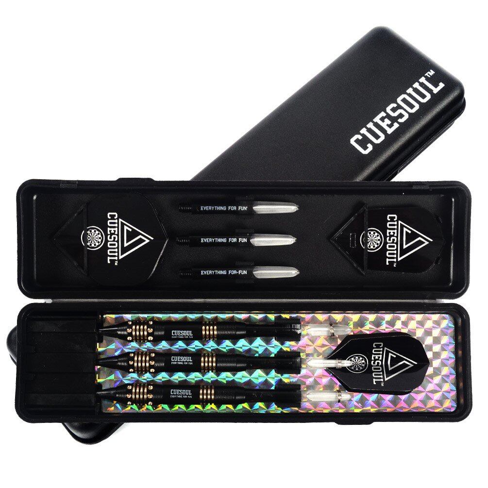 素材:ブラス(真鍮)バレル3本(16g/本)、耐久性のPC製いシャフト6本、フライト6枚、2ABソフトチップ3本、CUESOULデザインスリムケース1個、ダーツ単体重量:18g