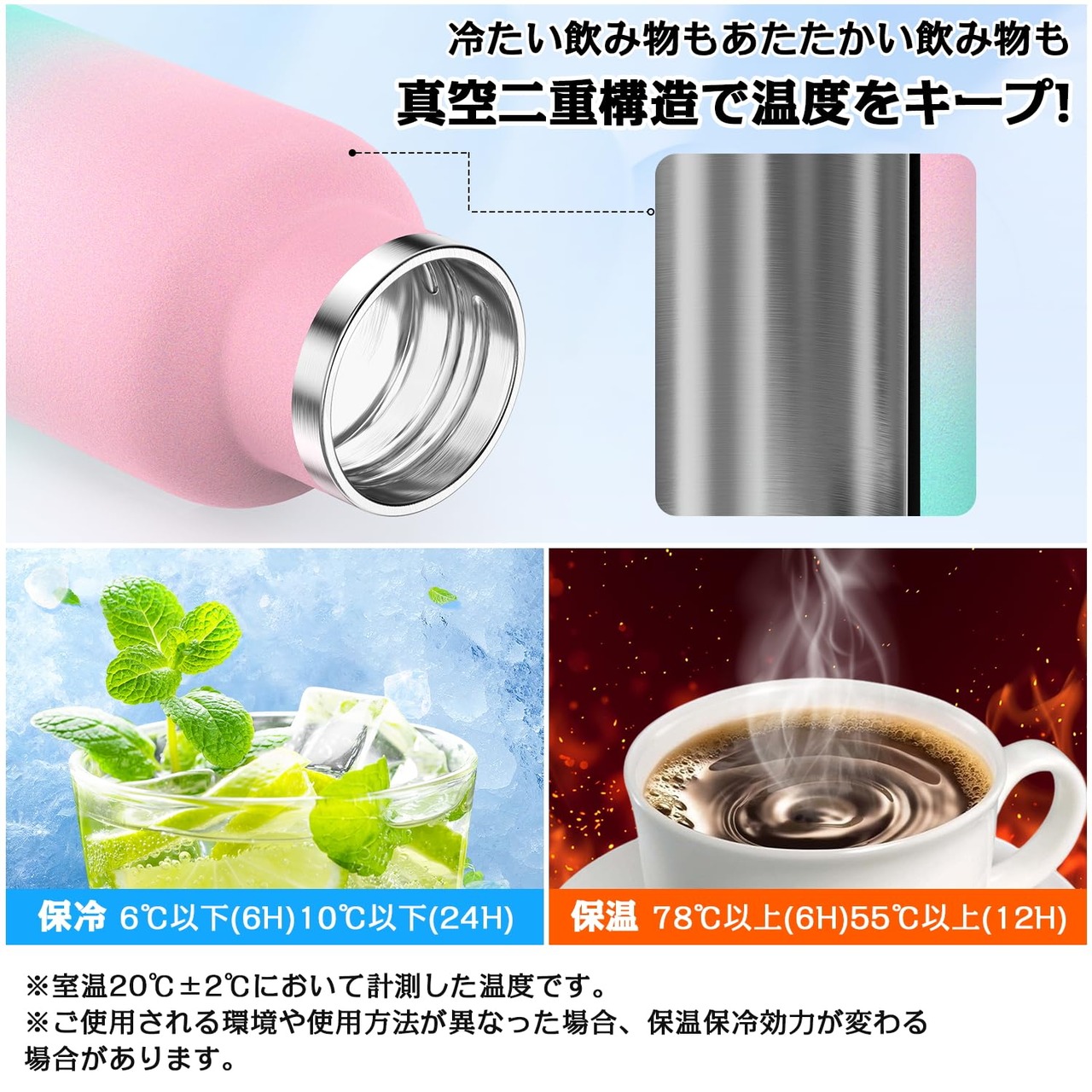 【優れた保温・保冷性能】 ◆ 二重真空断熱構造を採用し、飲み物の温度を長時間キープ。6時間後でも75℃以上、冷たい飲み物は5℃以下を保持できるため、12時間、24時間後でも適切な温度で美味しく飲むことができます。寒い時期に温かい飲み物を楽しみ、暑い日には冷たい飲み物でリフレッシュできます。