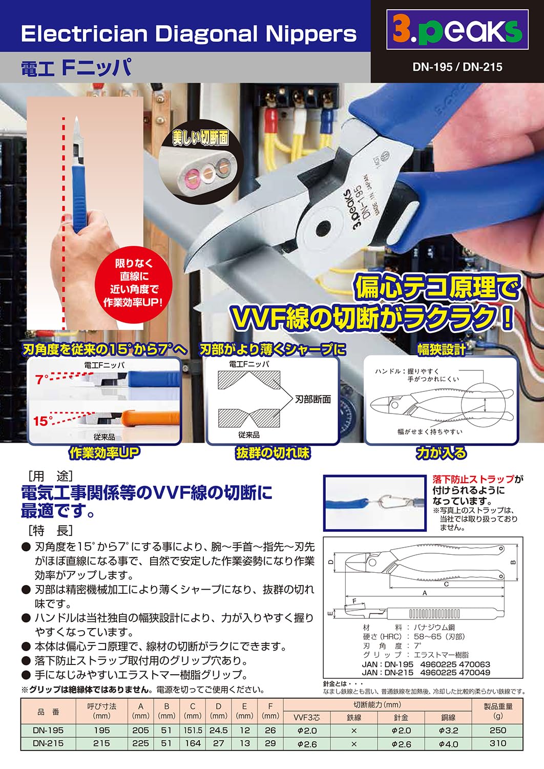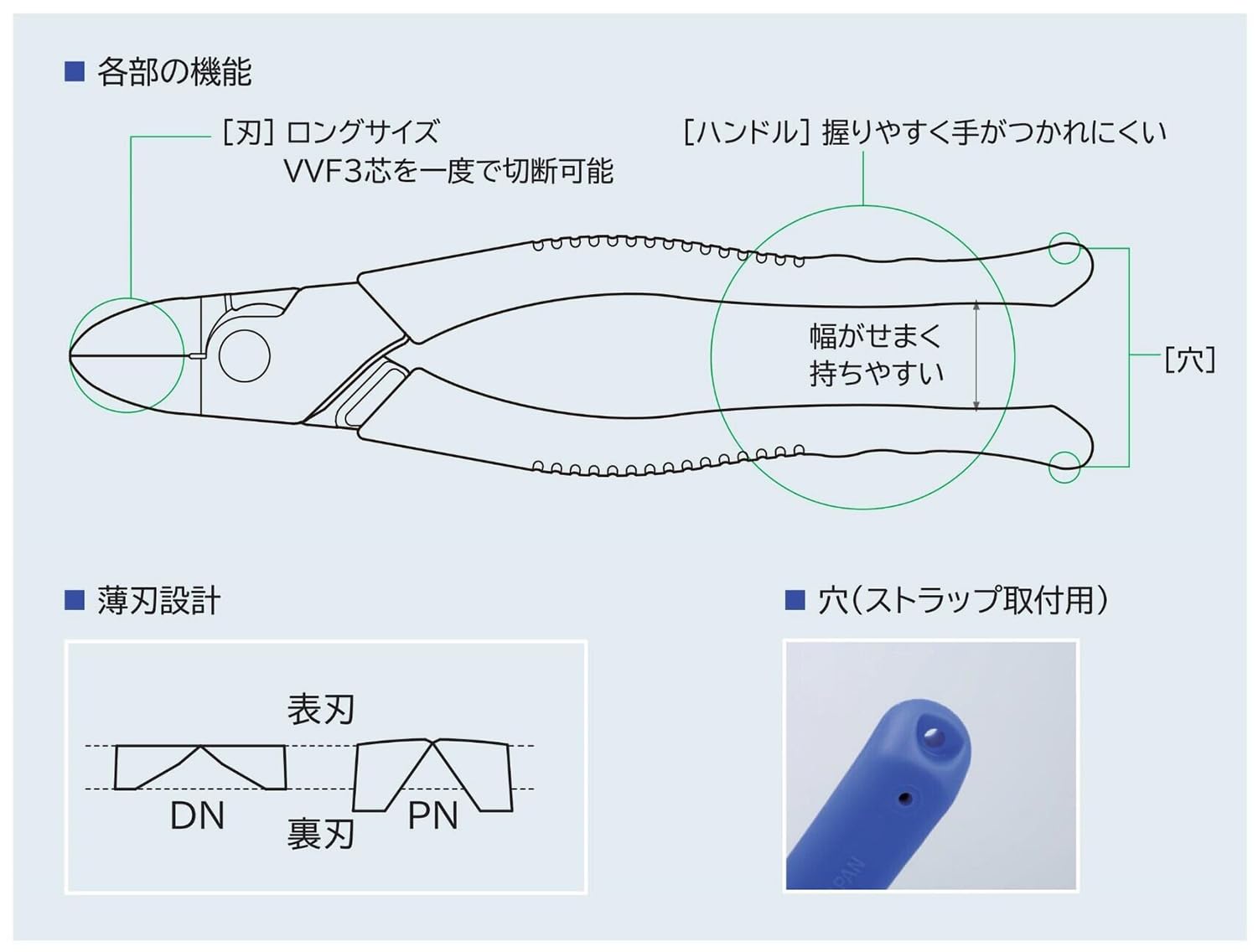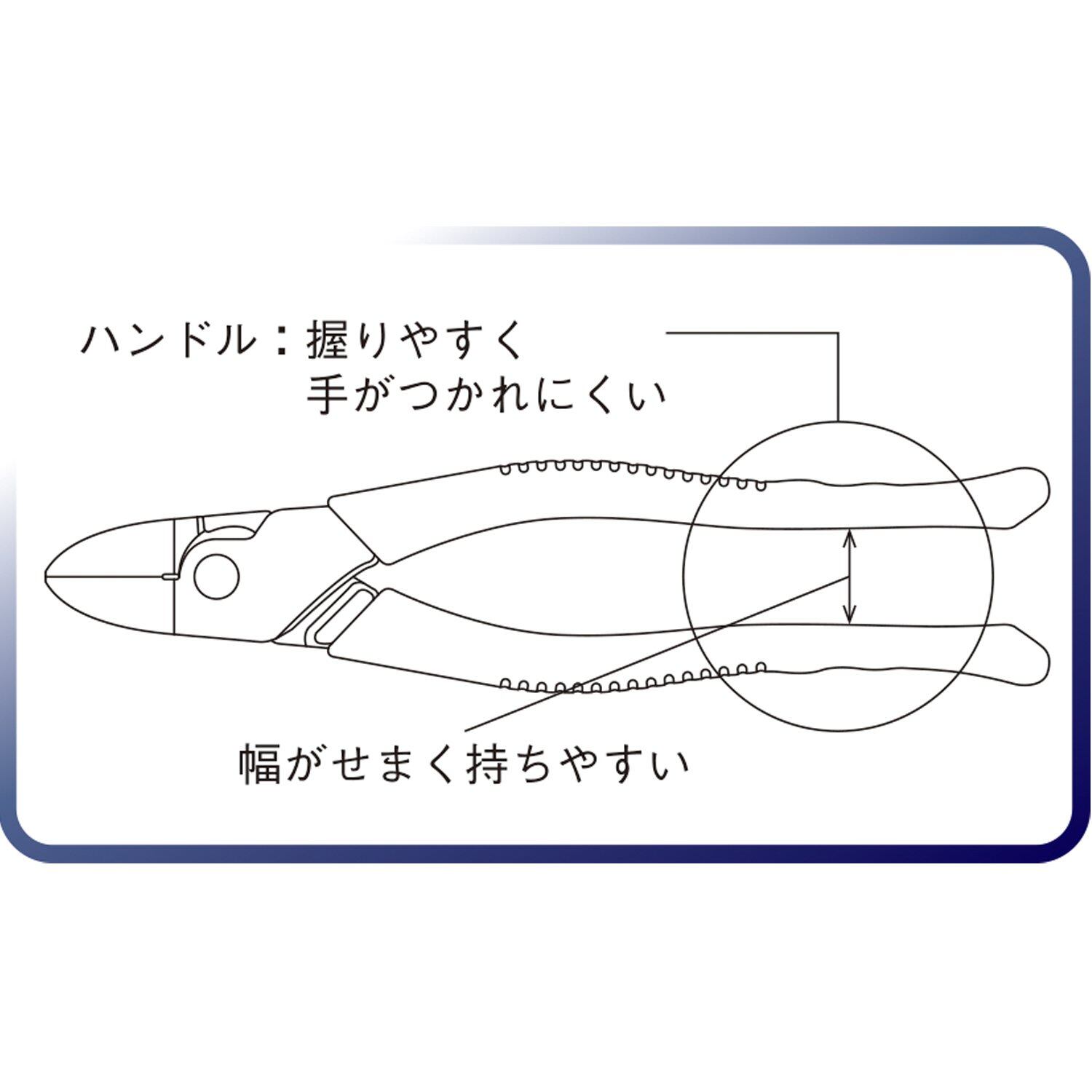 切断能力:VVF3芯/直径2.6mm、針金/直径2.6mm、銅線/直径4.0mm ※鉄線は切れません