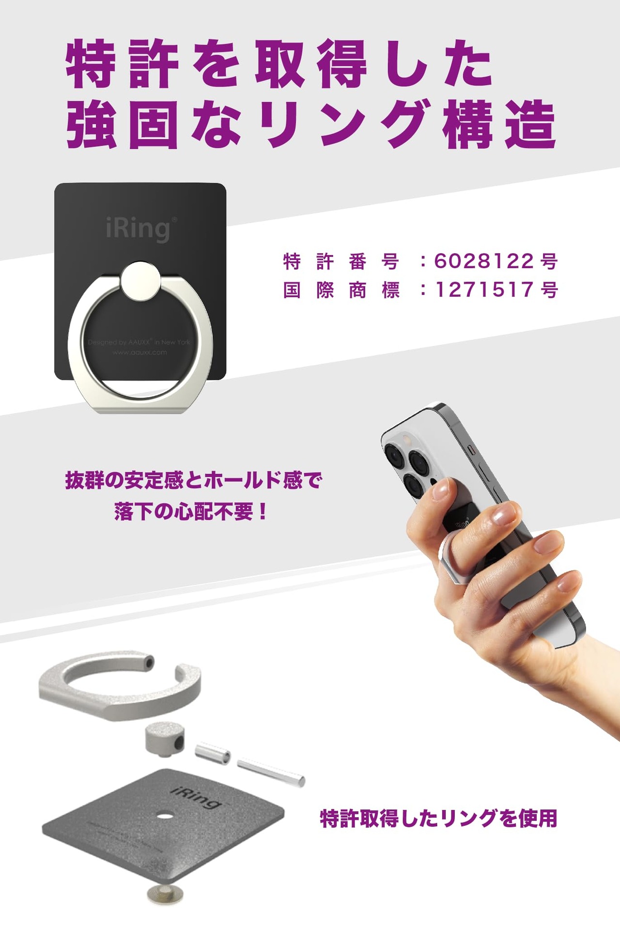 【快適なホールド感と落下防止】指を通すだけでスマートフォンを安定してホールド。片手での操作範囲が広がり、落下のリスクを軽減できるため、安心してご使用いただけます。