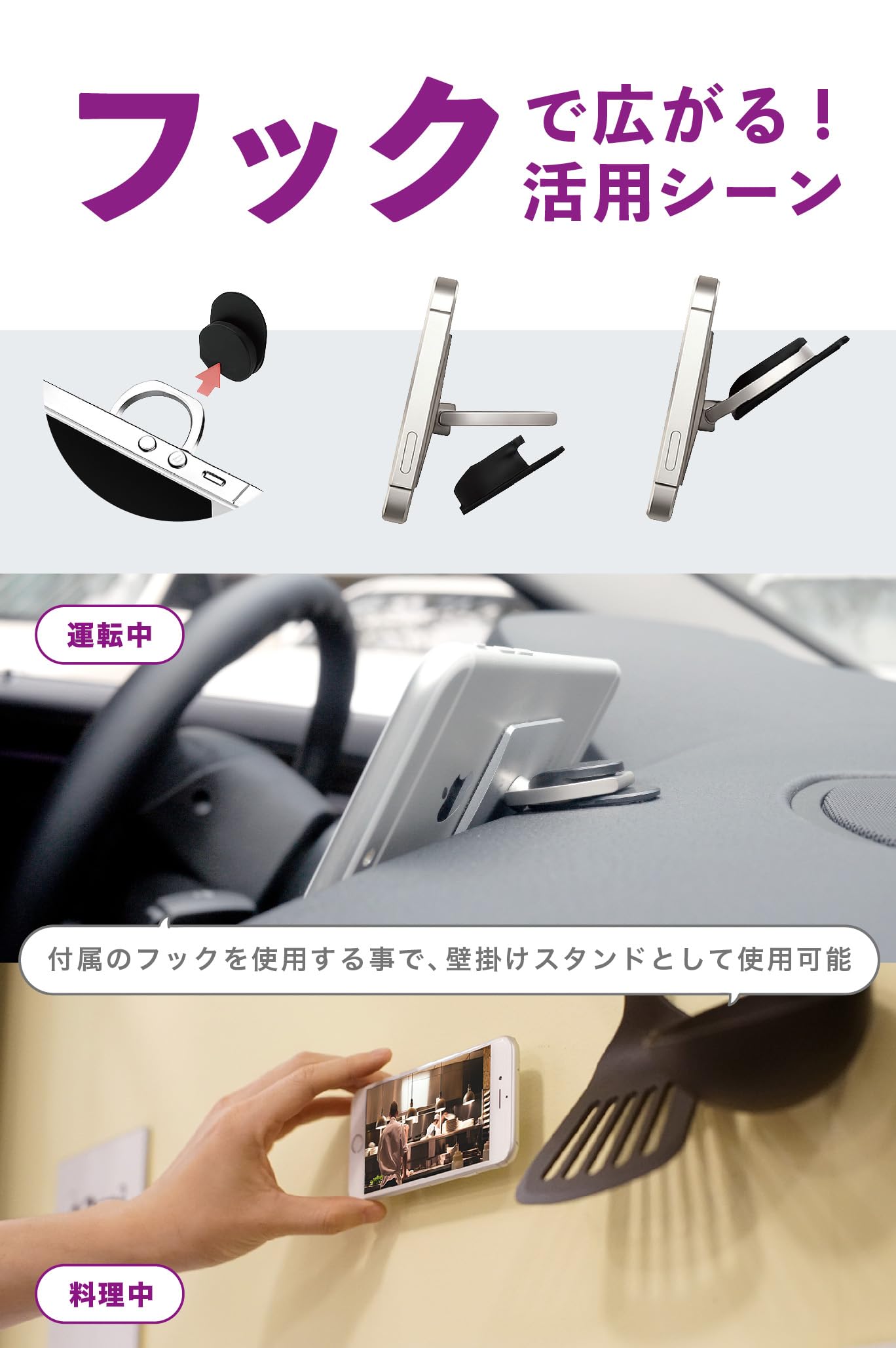 【便利なフック付属】付属の吊り下げフックを使えば、iRingを装着したスマートフォンを簡単に掛けることができます。車載ホルダーとしてだけでなく、キッチンやデスクなど、様々な場所で平面に装着して活用できます。