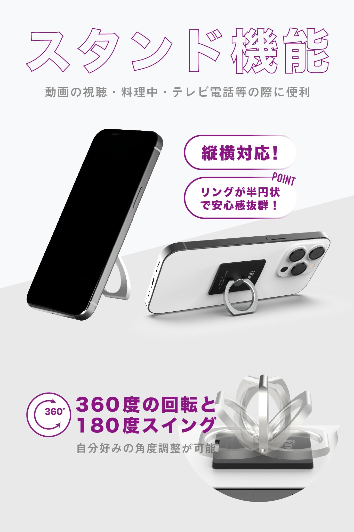 【自由自在なスマホスタンド機能】リングを立てることで、縦置き・横置きに対応する便利なスマホスタンドに早変わりします。360°回転と180°スイング機能を備えているため、動画視聴やビデオ通話など、シーンに合わせてお好みの角度でハンズフリーに楽しめます。