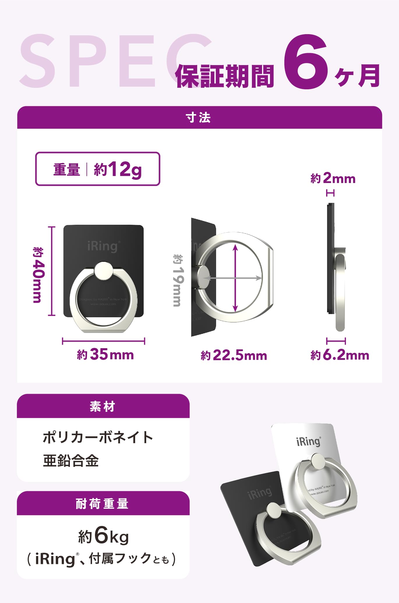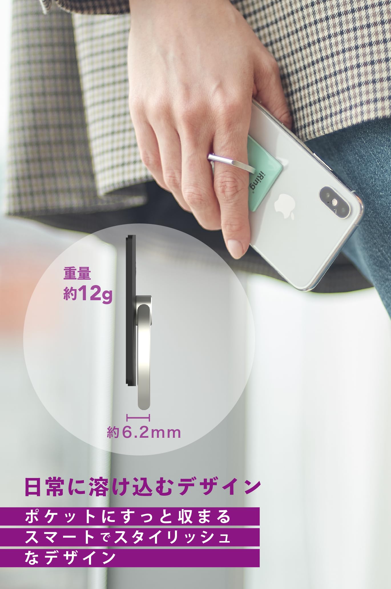 【スリム&洗練されたデザイン】本体の薄さは約2mm、リングを含めても約6.2mmという超薄型設計です。スマートフォンの外観を損なわず、ポケットやカバンにもスムーズに収まります。洗練されたマット調の仕上がりは、かっこよさだけでなく、どことなく可愛らしい雰囲気も持ち合わせているため、女性にも人気です。