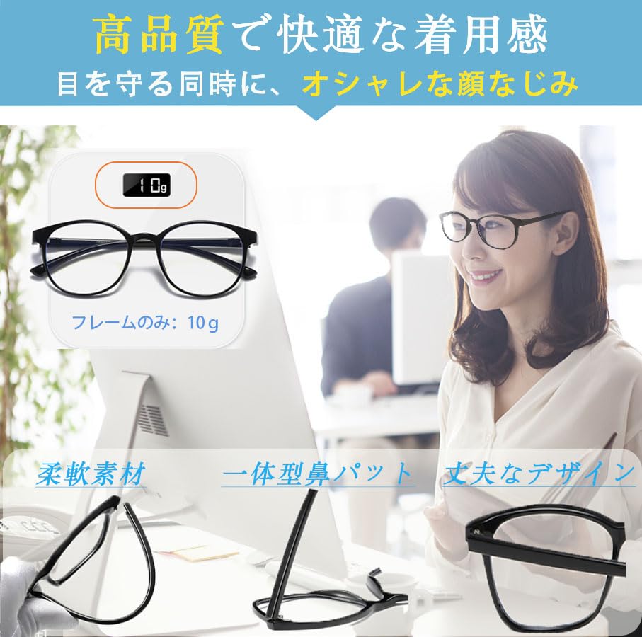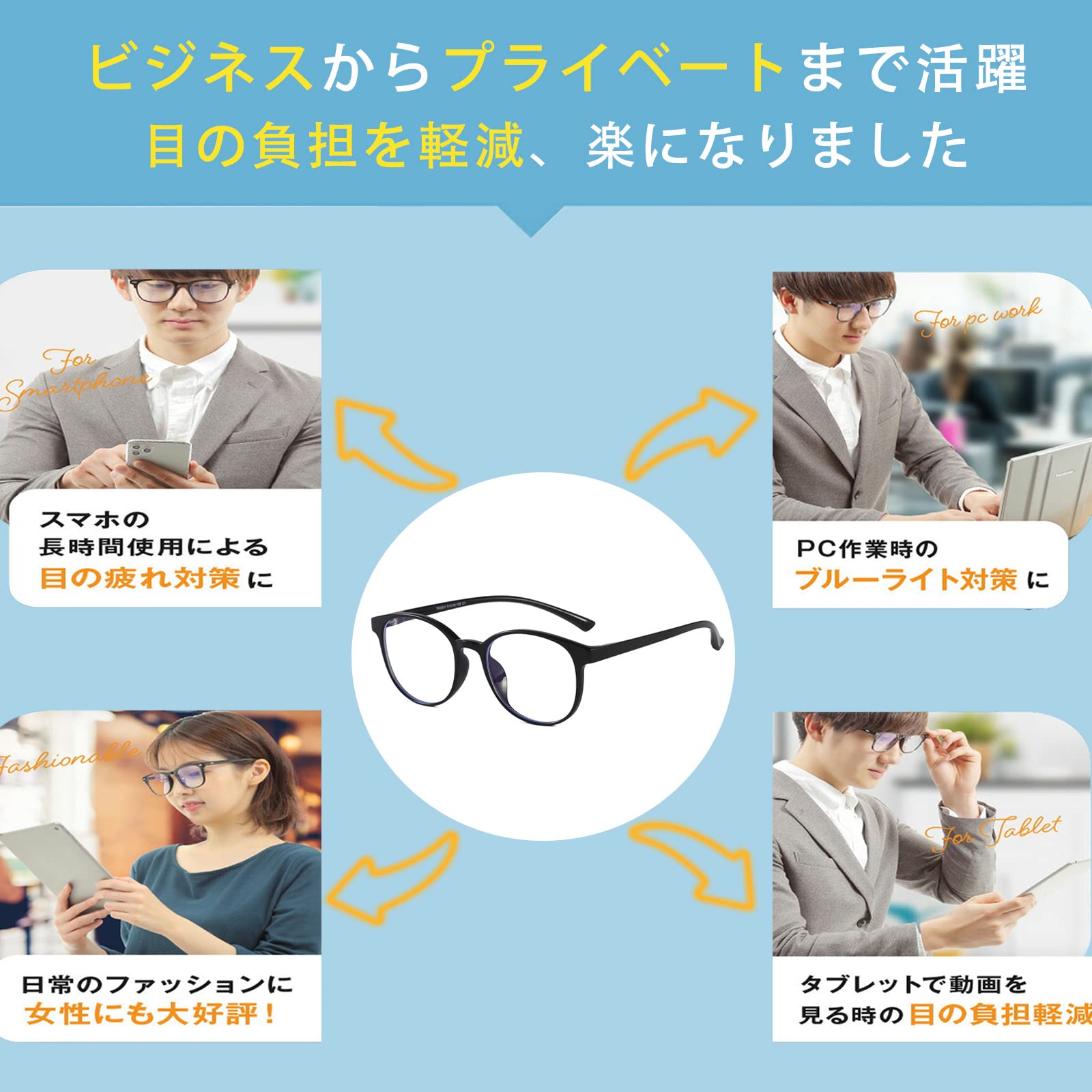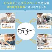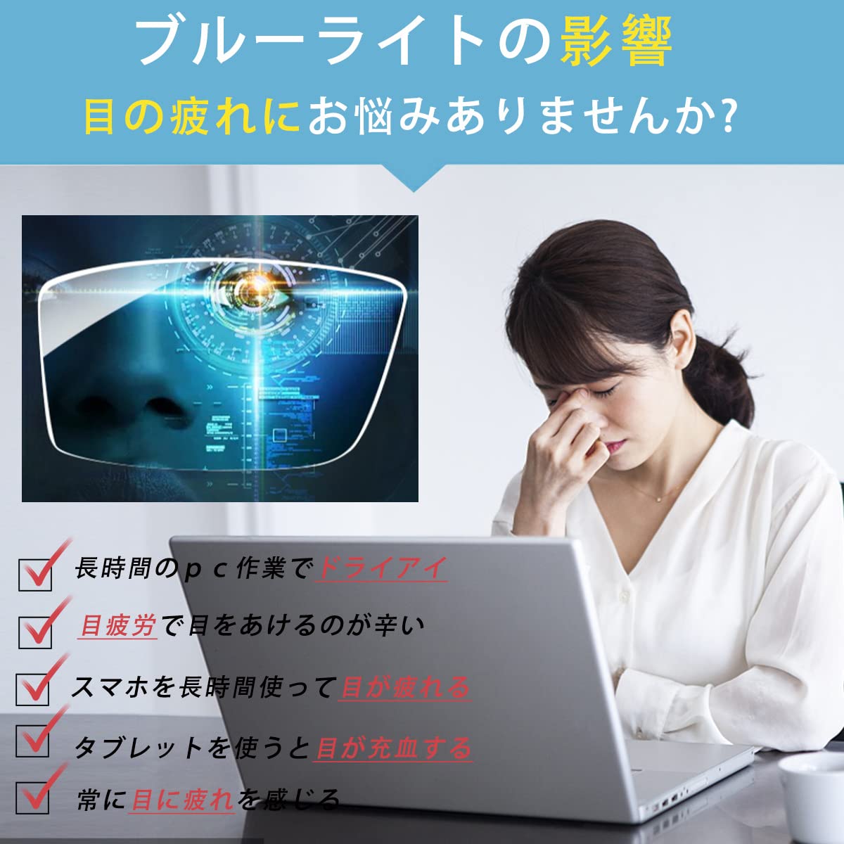 ??【目にやさしい】PCやスマホ、TVからの ブルーライトは視力悪化やドライアイ、眼精疲労、メラニンの生成によって起こる浅い睡眠などの原因となるので、PCメガネはひとつでもあてはまったらブルーライトから目を保護します。着用することで、まぶしさやちらつきを軽減する効果が期待でき、長時間の作業による目の疲れにお悩みの方をサポートしてくれます。