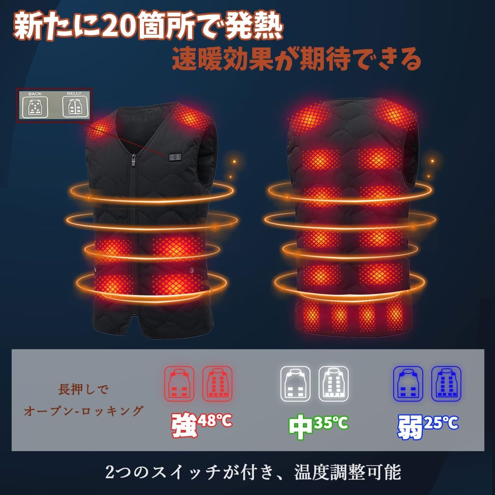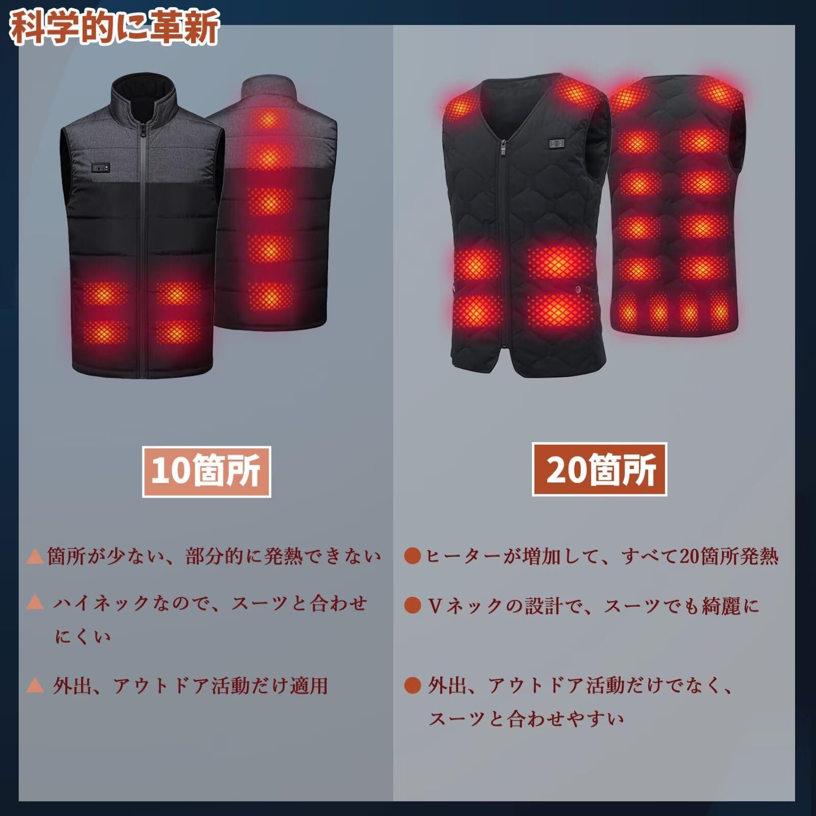 革新:この電熱ベストは20箇所加熱ベストです。昔の11箇条より、首の後、肩でヒーターが備えて、腹中と背中にもヒーターが増加して、もっと暖かいです。