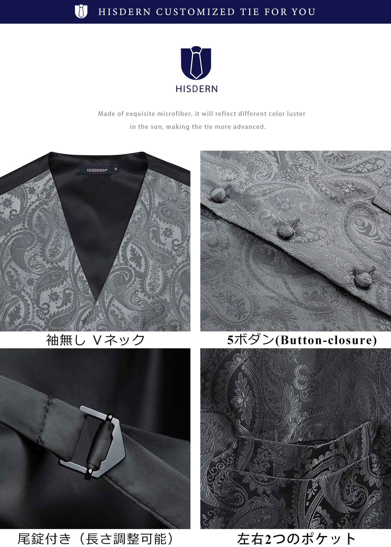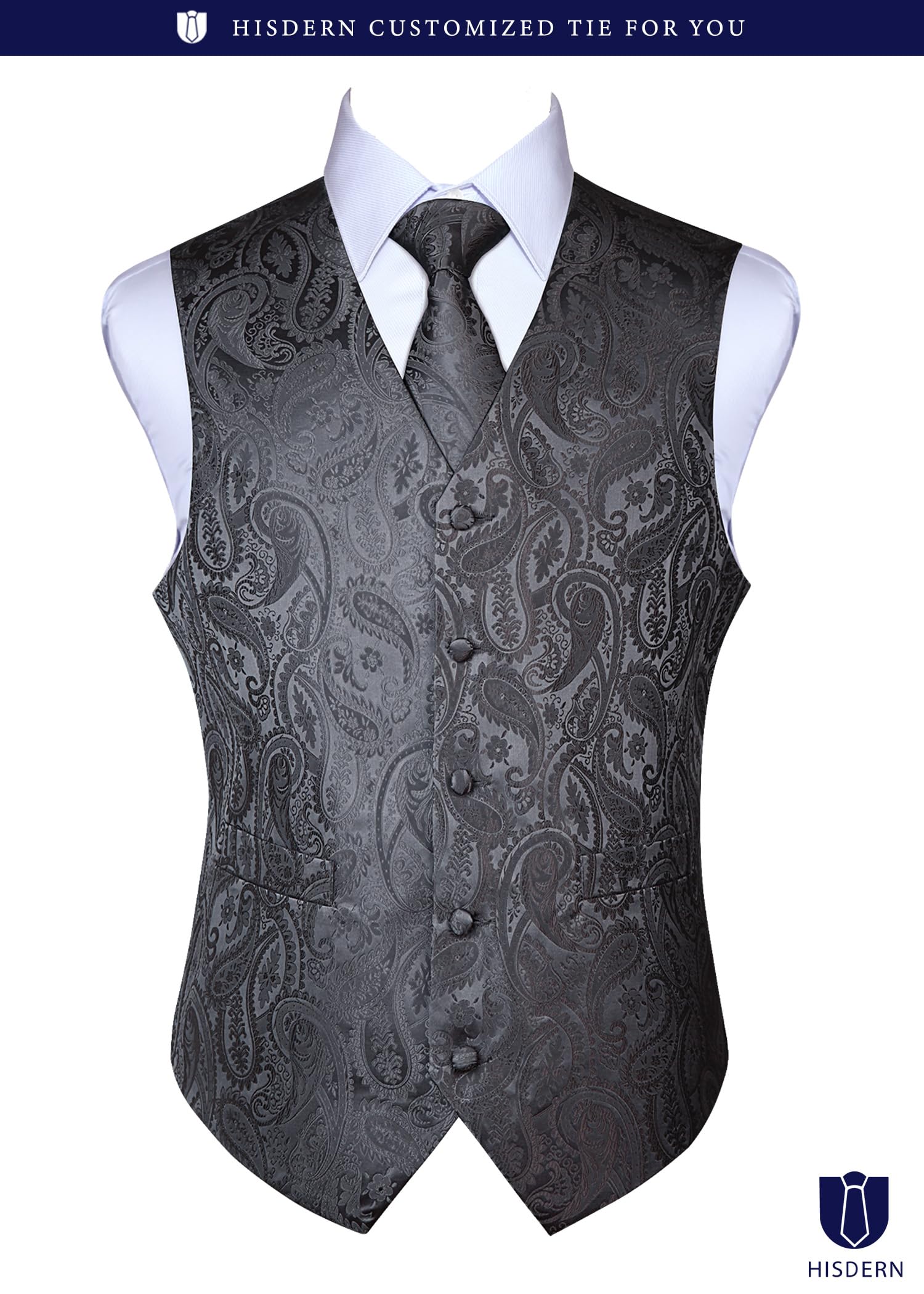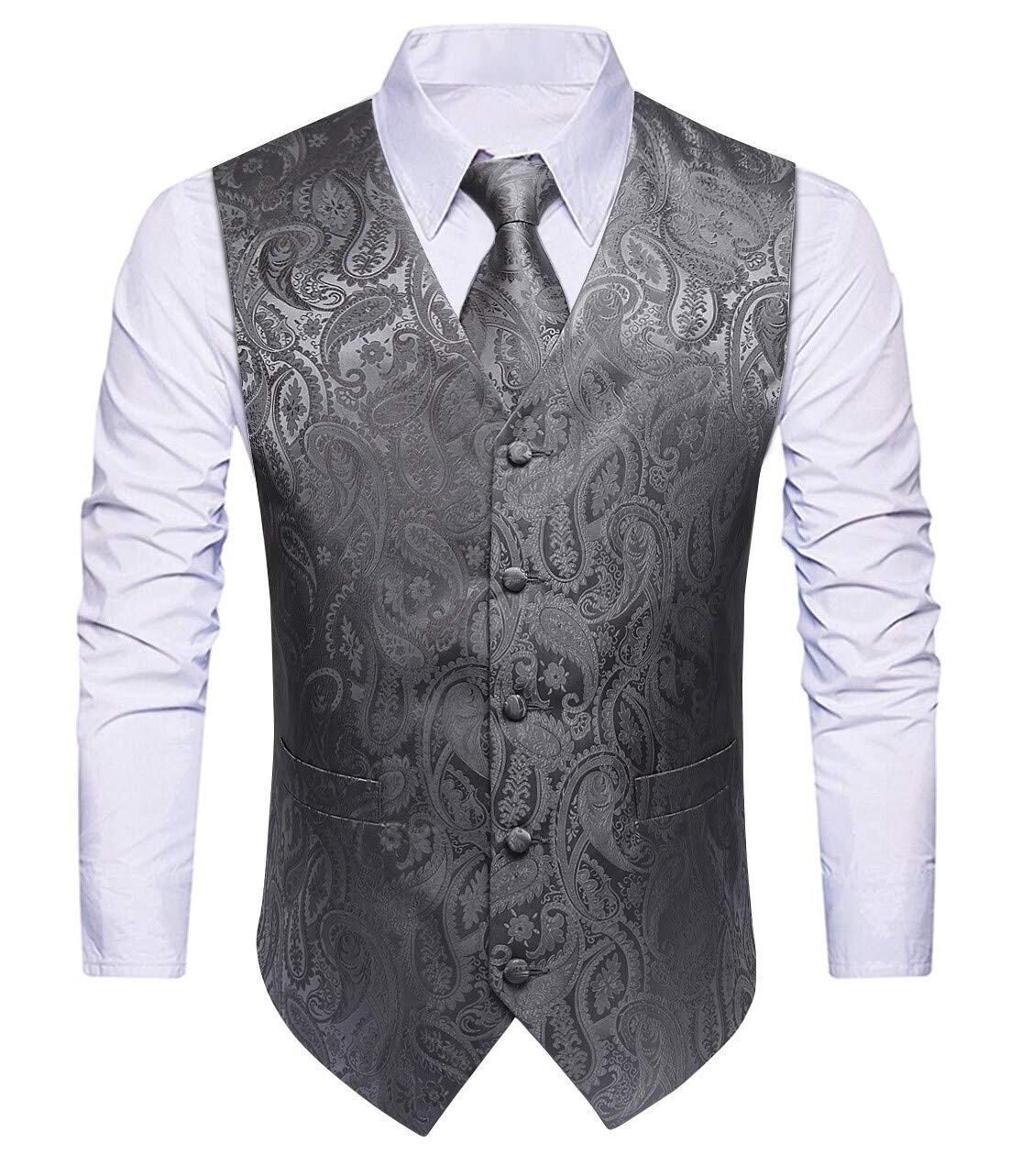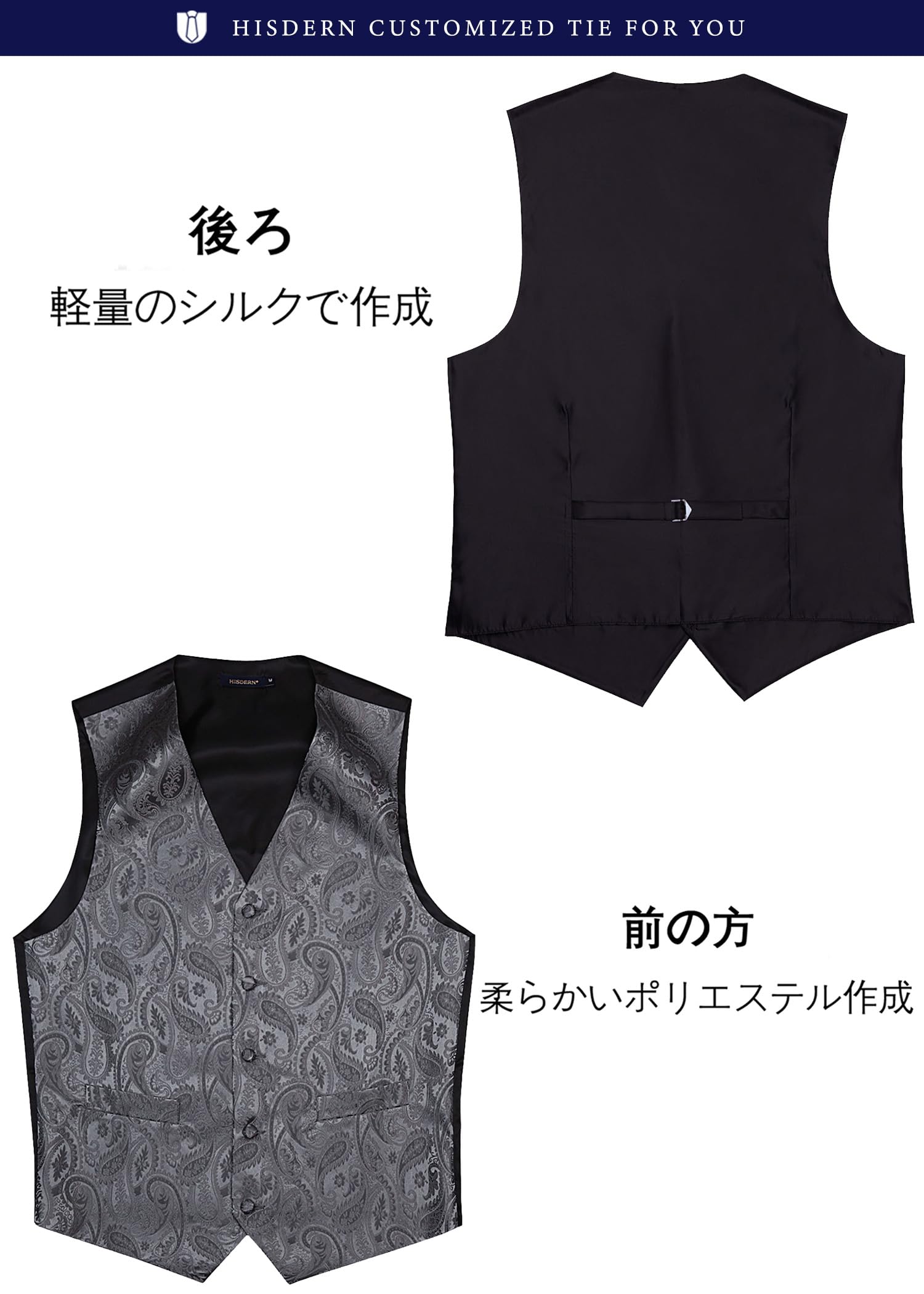 [HISDERN] V3-01 ペイズリー スーツ ベスト メンズ ネクタイ ポケットチーフ 3点 セット フォーマル 結婚式 ベスト 大きいサイズ フィット 2ポケット 紳士 礼服 大きいサイズ