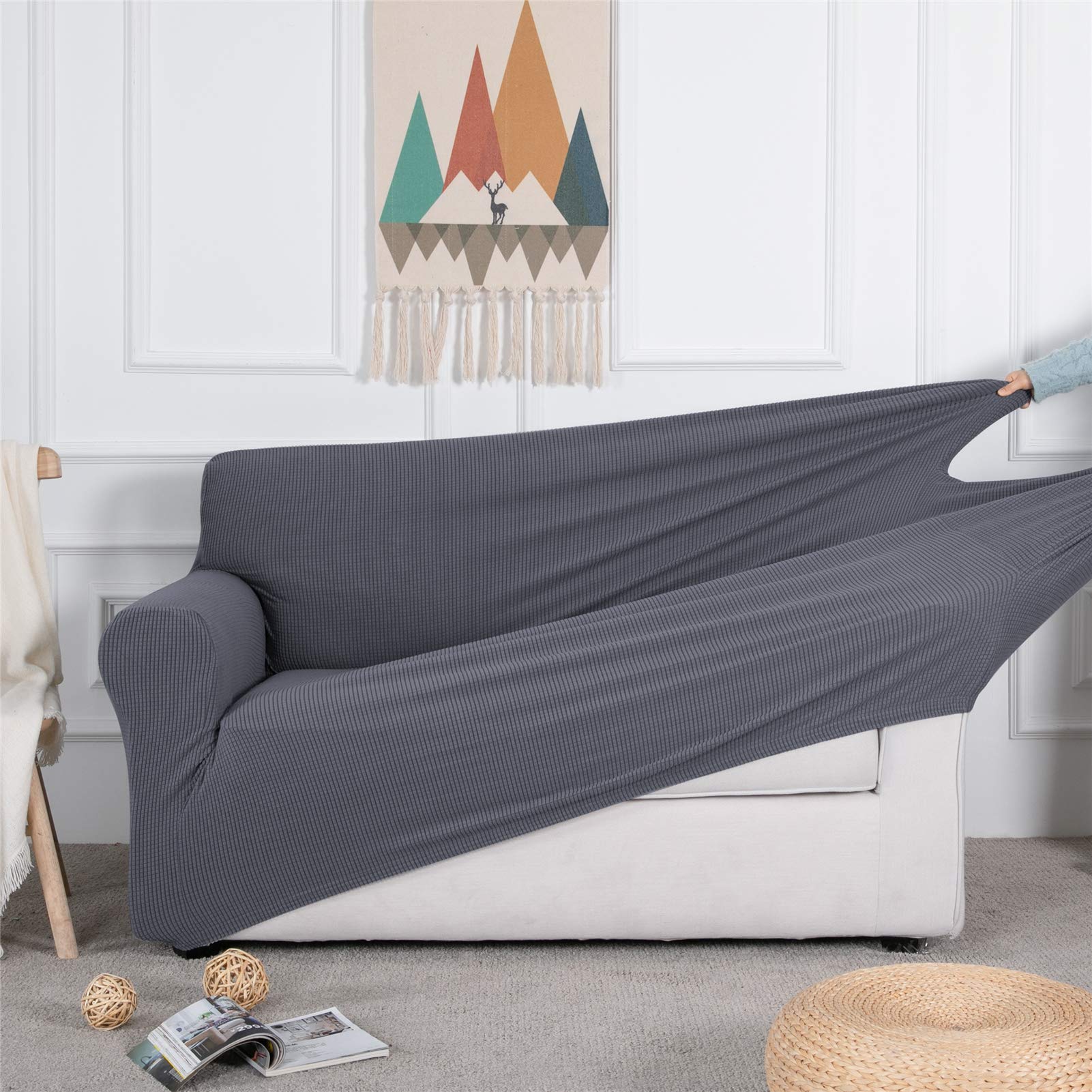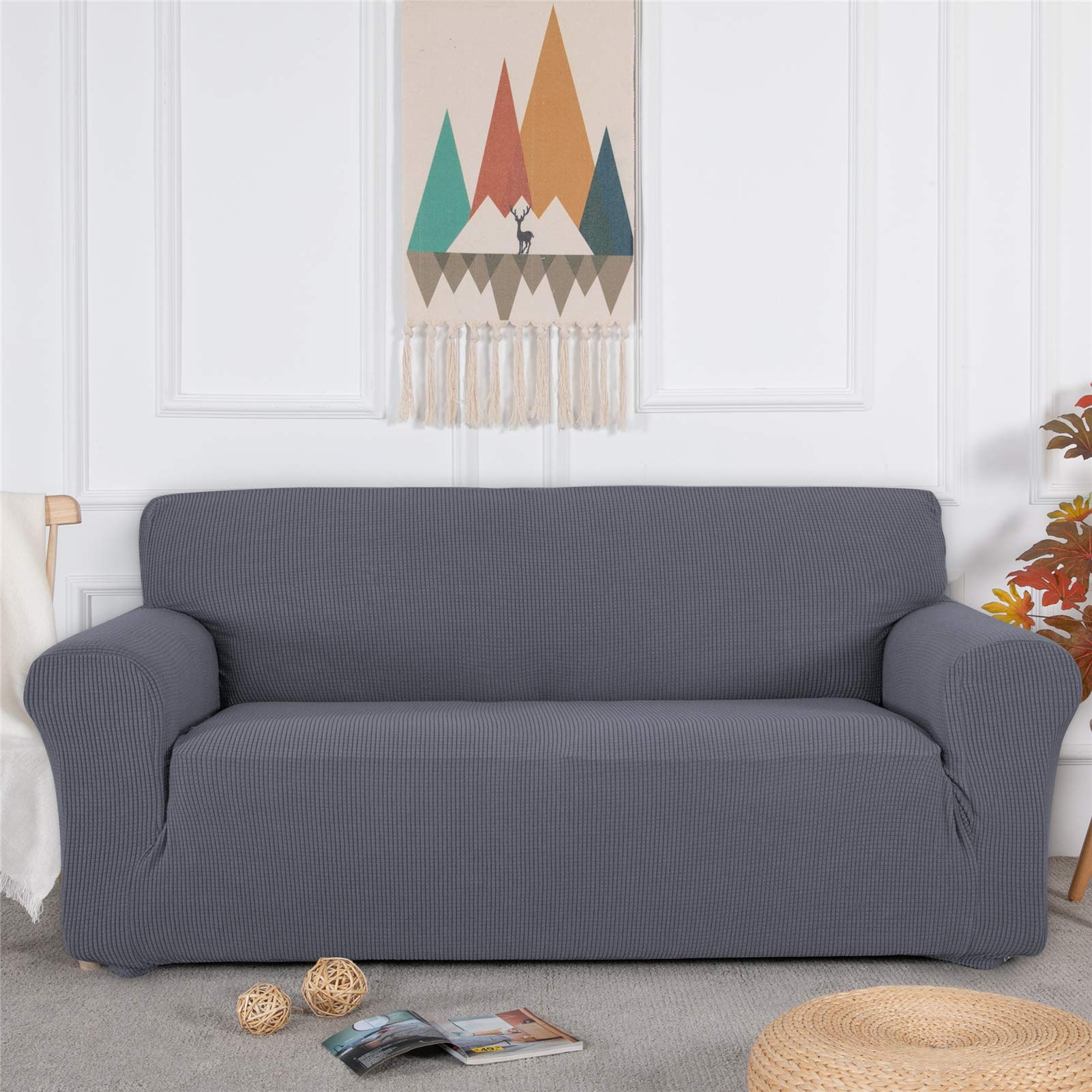 Topfinel ソファーカバー 3人掛け 肘付き 無地 北欧風 ストレッチ フィットタイプ 伸縮素材伸び良く 滑り止め 柔らかい 犬 猫 傷 防止 超便利 四季適用(グレー)