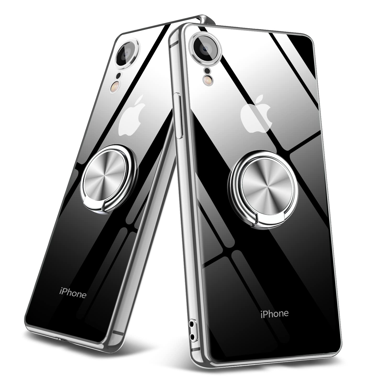 iPhone XR 用ケース クリア リング付き TPUケース 車載ホルダー メッキ加工 スタンド機能 透明 薄型 アイフォンxr用カバー 全面保護 軽量 シリコン 黄変防止 ストラップホール付き レンズ保護 滑り防止 人気 携帯カバー 銀 YZ1-182