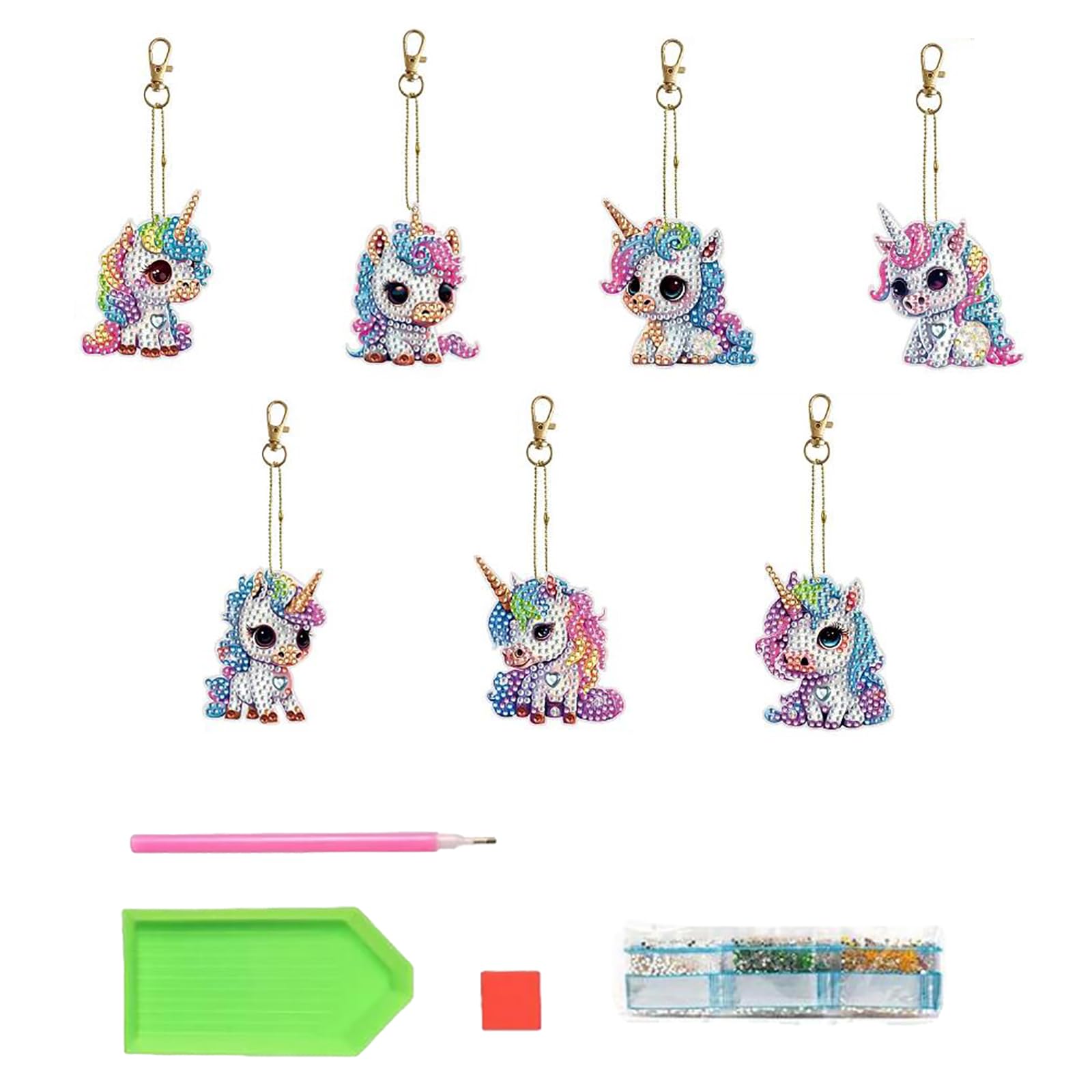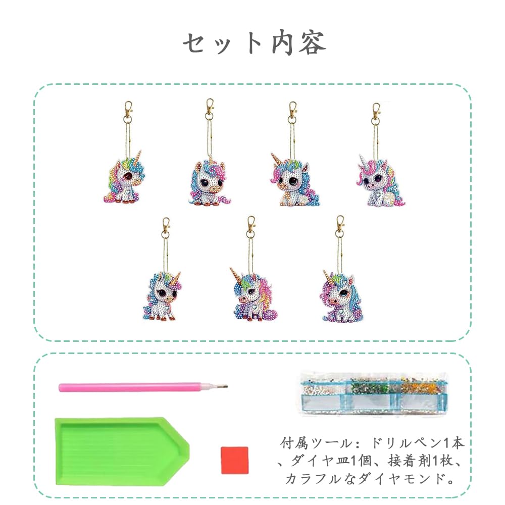 【セット内容】キーホルダーペンダント7個入り。付属ツール:ドリルペン1本、ダイヤ皿1個、接着剤1枚、カラフルなダイヤモンド。