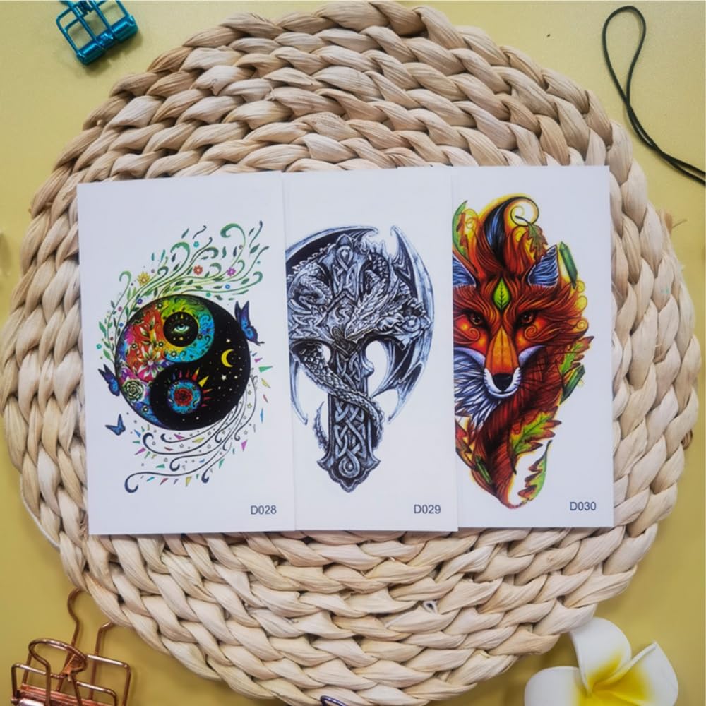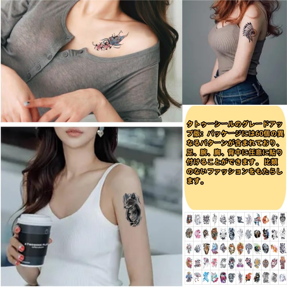 【セット内容】タトゥーシール 60枚セット、パッケージには60個の異なるパターンが含まれており、足、腕、胸、背中に任意に貼り付けることができます。