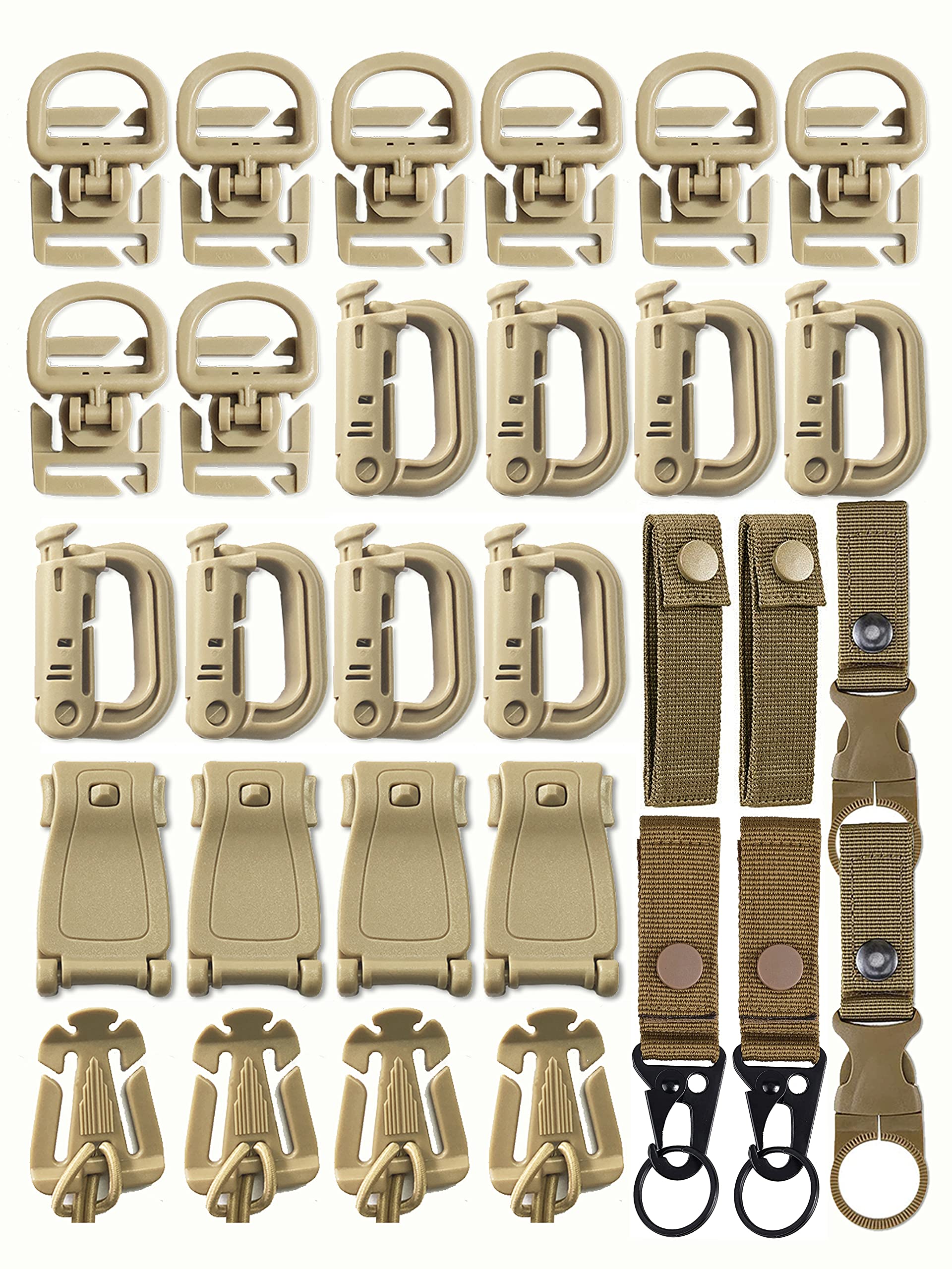 7種類全部30個セットあらゆる種類のニーズを満たす大容量 :ブラスチックカラビナ*8+ ウェブドミネーター*4+ベルクロ式ベルトキーホルダー*2 + Dリング 360 回転 フック ホルダ*8+タイ ロック吊り*2+ウェビングクリップ*4+ペットボトルホルダー ボトル ック ?量*2 コスパ抜群 モールシステム対応 サバゲなどに最適