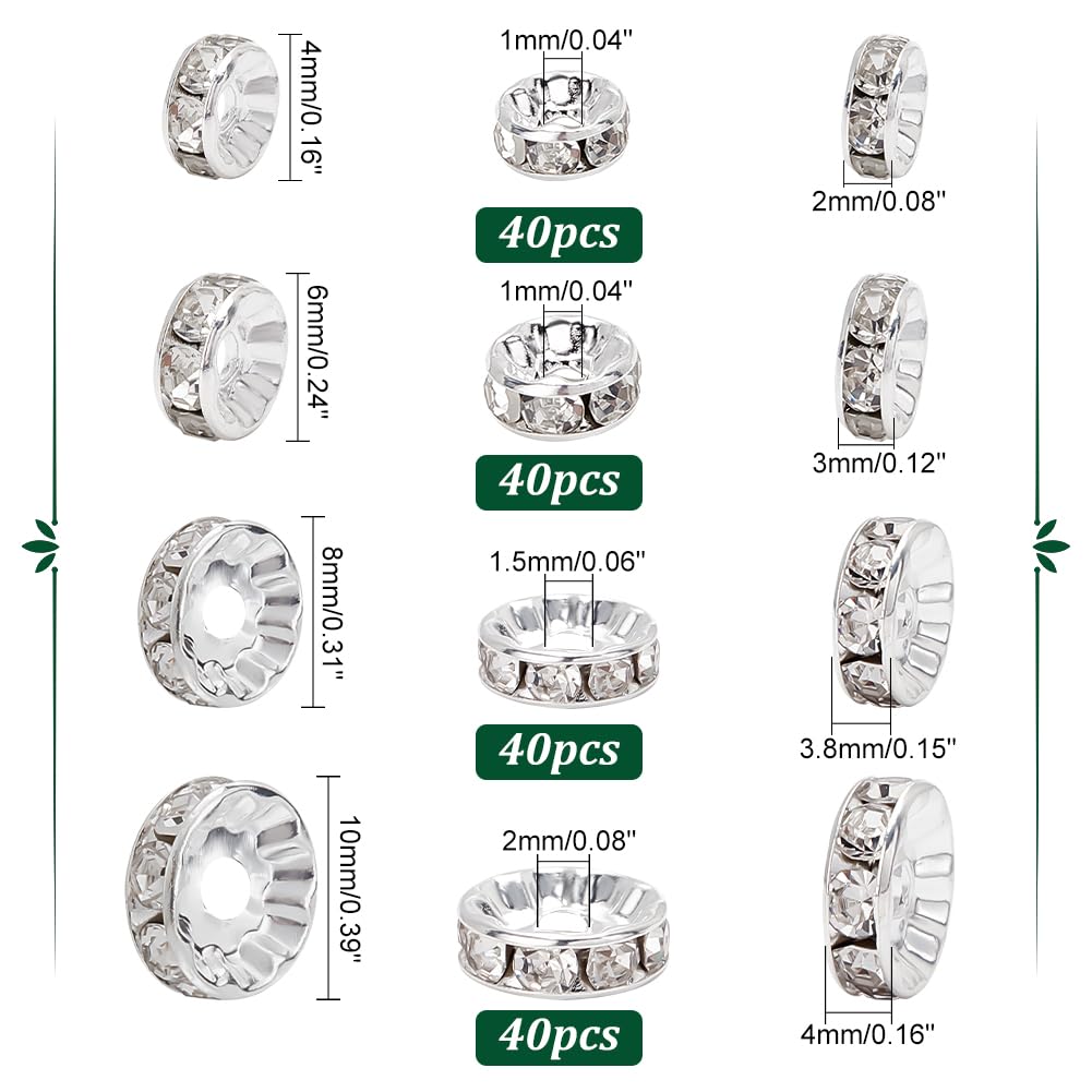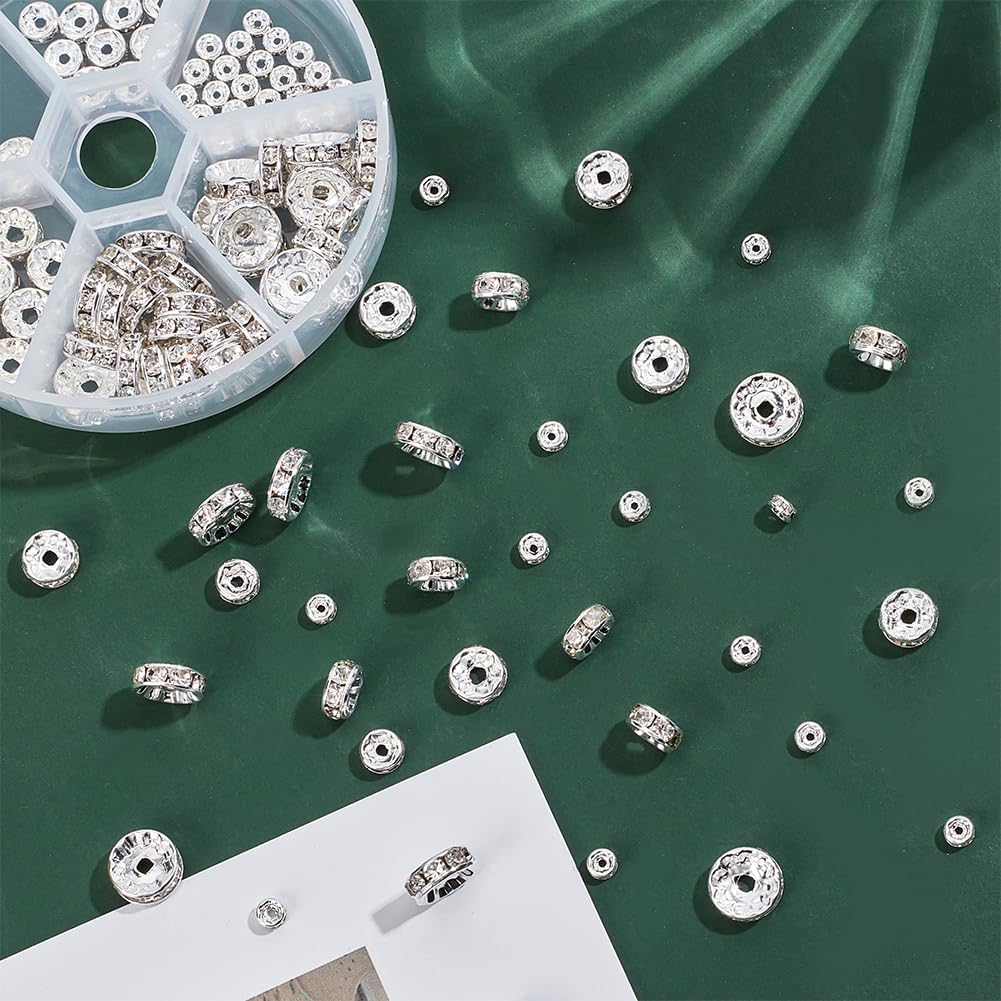 PH PandaHall 約160個/箱 ロンデル 4/6/8/10mm 平型ロンデル 真鍮 ラインストーン付き スペーサービーズ メタル ビーズ アクセサリーパーツ ジュエリー 手芸用品 クラフト用品 手作り素材 材料 シルバー
