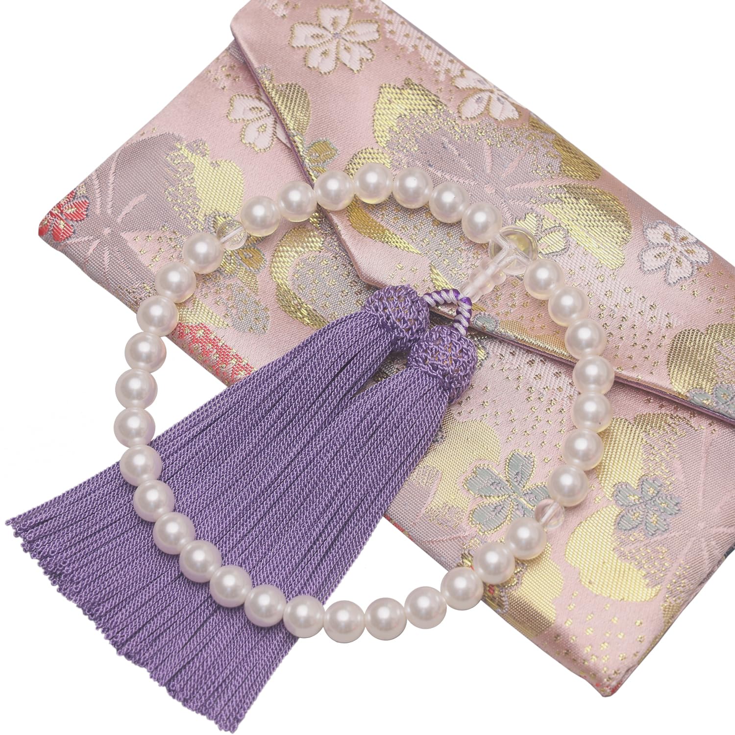 【在庫処分】数珠 女性用 本水晶 星月菩提樹 念珠 葬式 葬儀 お通夜 略式 じゅず 数珠袋付き すべての宗派で使える (貝パール/藤)