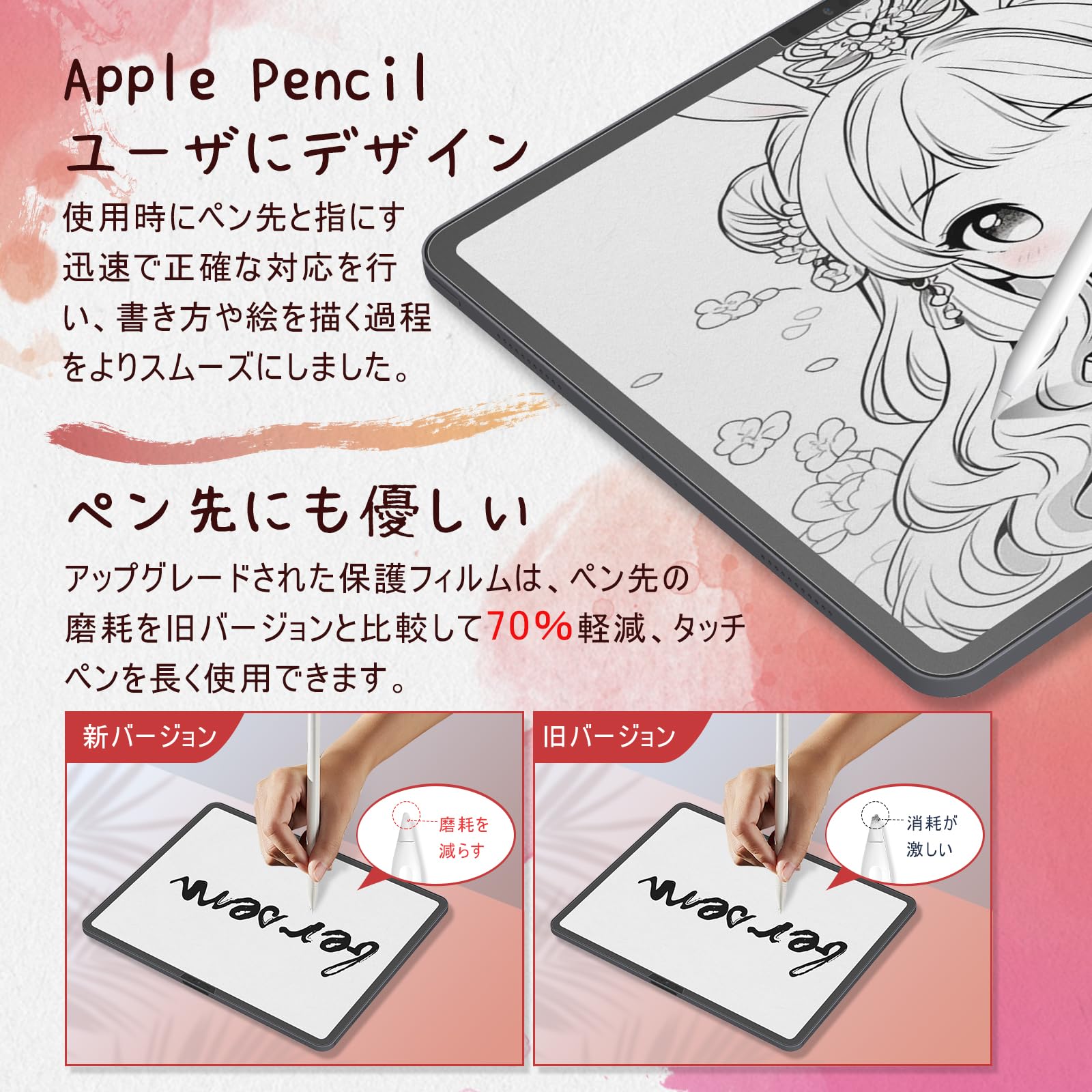 【ペン先の摩耗防止・高感度】グレードアップした iPad Pro 11 インチ 2024 フィルム保護フィルムのペン先の摩耗度は70%軽減されていて、タッチペンが大幅に長持ちします。Apple Pencilユーザーのために設計されていて、極薄フィルムはペンや指先に対する反応がスムーズで正確、快適な書き心地を味わうことができる、文字やイラストを書くタッチペンユーザーにとって理想的な製品です。
