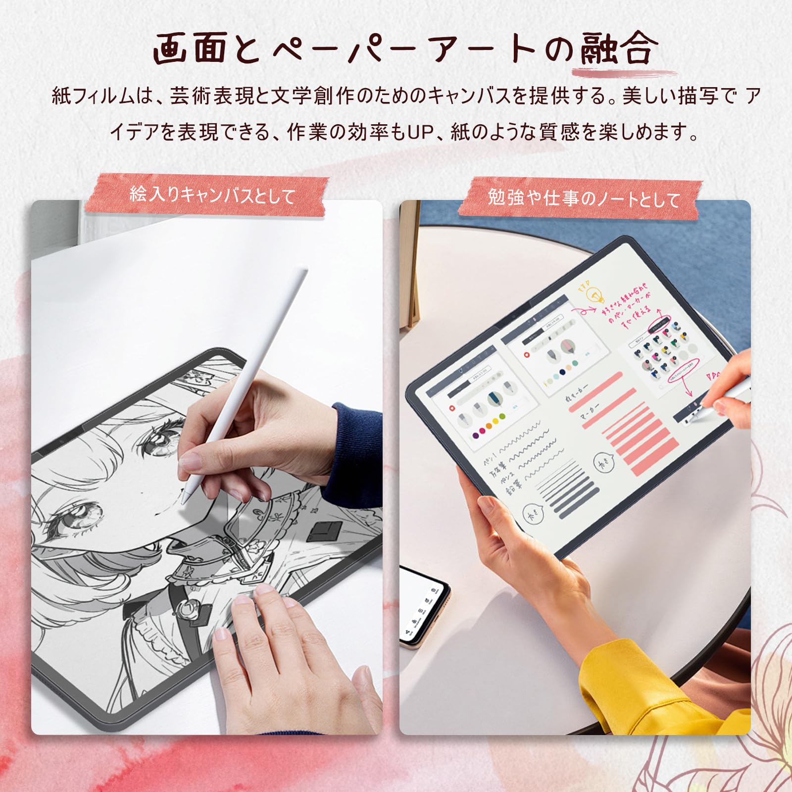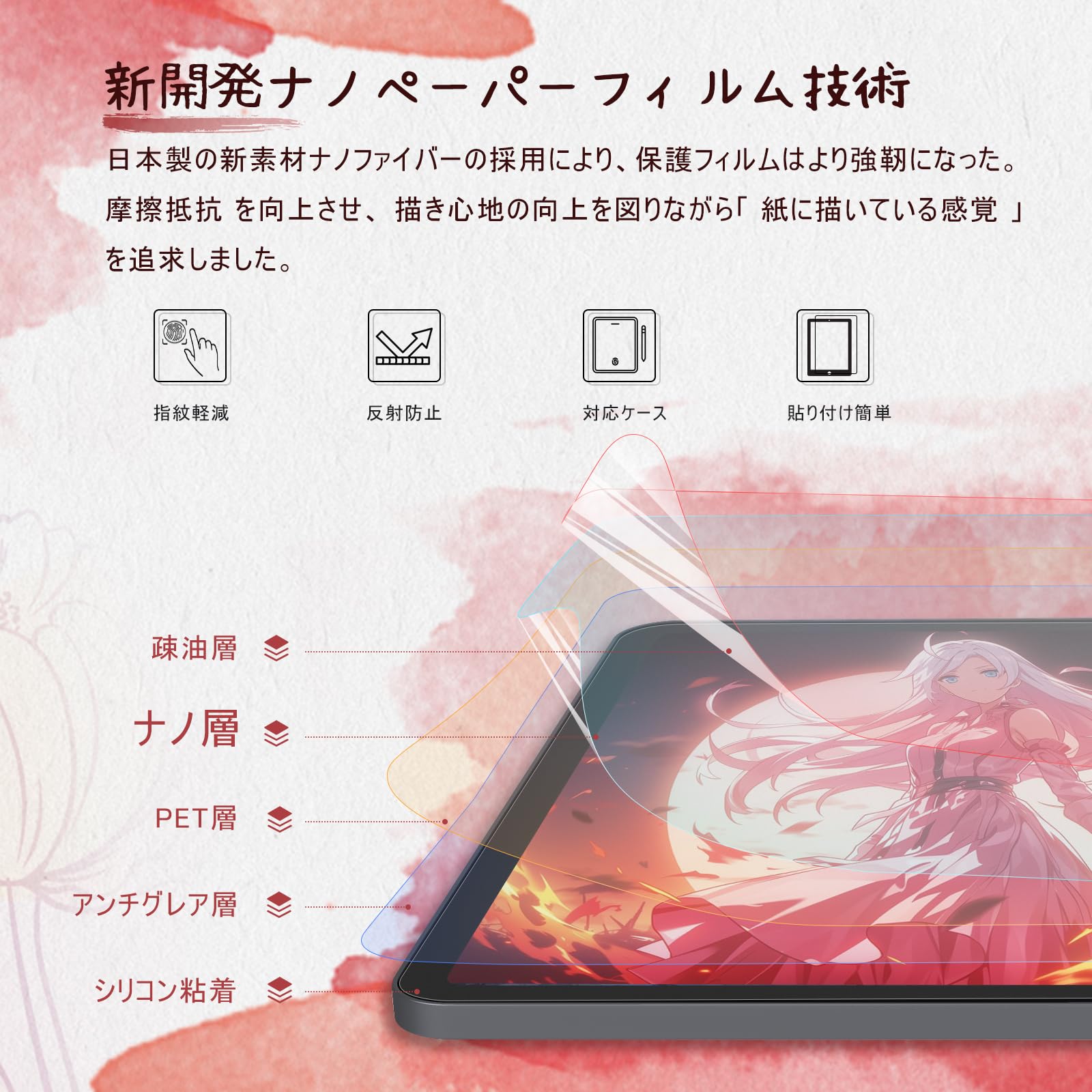 【新開発ナノペーパーフィルム】日本で最新のナノ繊維素材と特殊な表面加工を採用、BERSEMペーパーライクフィルムは芸術を表現したり文学創作をする場を提供する、液晶と紙の芸術の融合です。ほどよい抵抗感がペンの滑りを抑え、書いているときにはシャシャという音がして、本物の紙に文字やイラストを書いているような感覚を味わえます。快適な使用感もアップ、さらに集中することができ、仕事や学習の効率が大幅にアップします。
