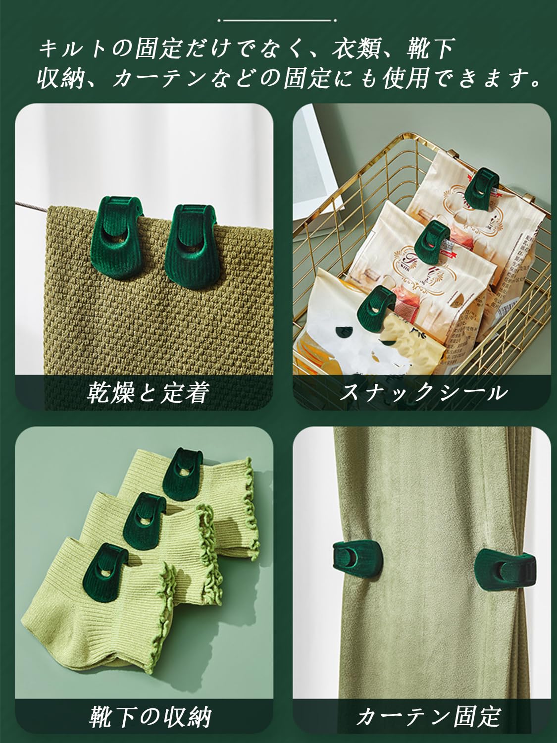 【幅広い用途】羽毛掛け布団、厚手の掛け布団、厚手の掛け布団、厚手の掛け布団カバー、厚い掛け布団カバーを収納できるだけでなく、当社のキルトクリップは他のほとんどの場面で使用できます。 例えば、カーテンを固定したり、風で飛ばされるのを防いだり、靴下などの小物を収納したりすることができます。 これにより、家庭環境がより整頓されます。