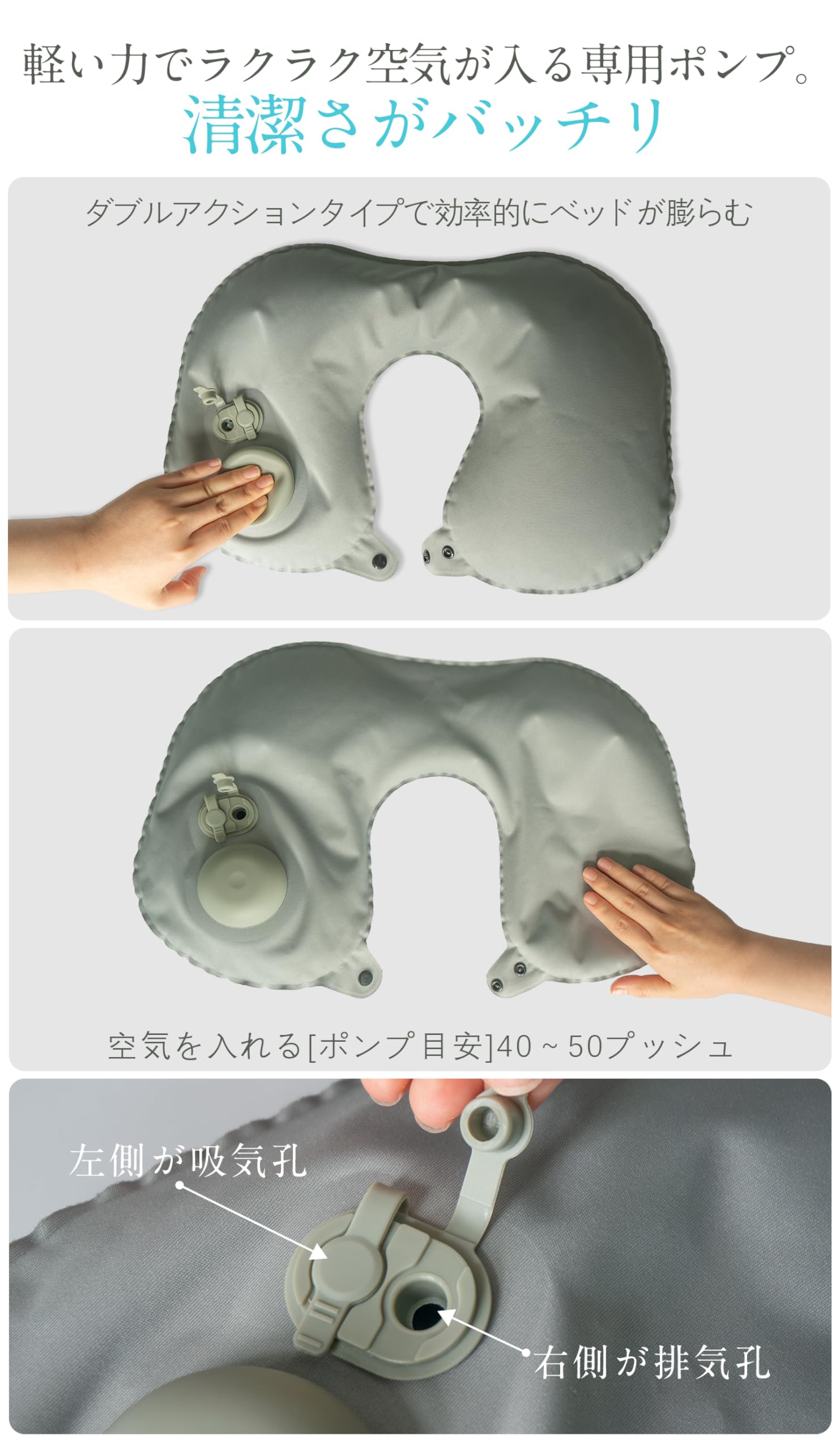 【ポンプ内蔵式】内蔵のポンプで最速30秒で膨らまされます。細菌の拡散を防ぐためにロを吹かない。膨らました後に、お好みの高さを調節可能です。
