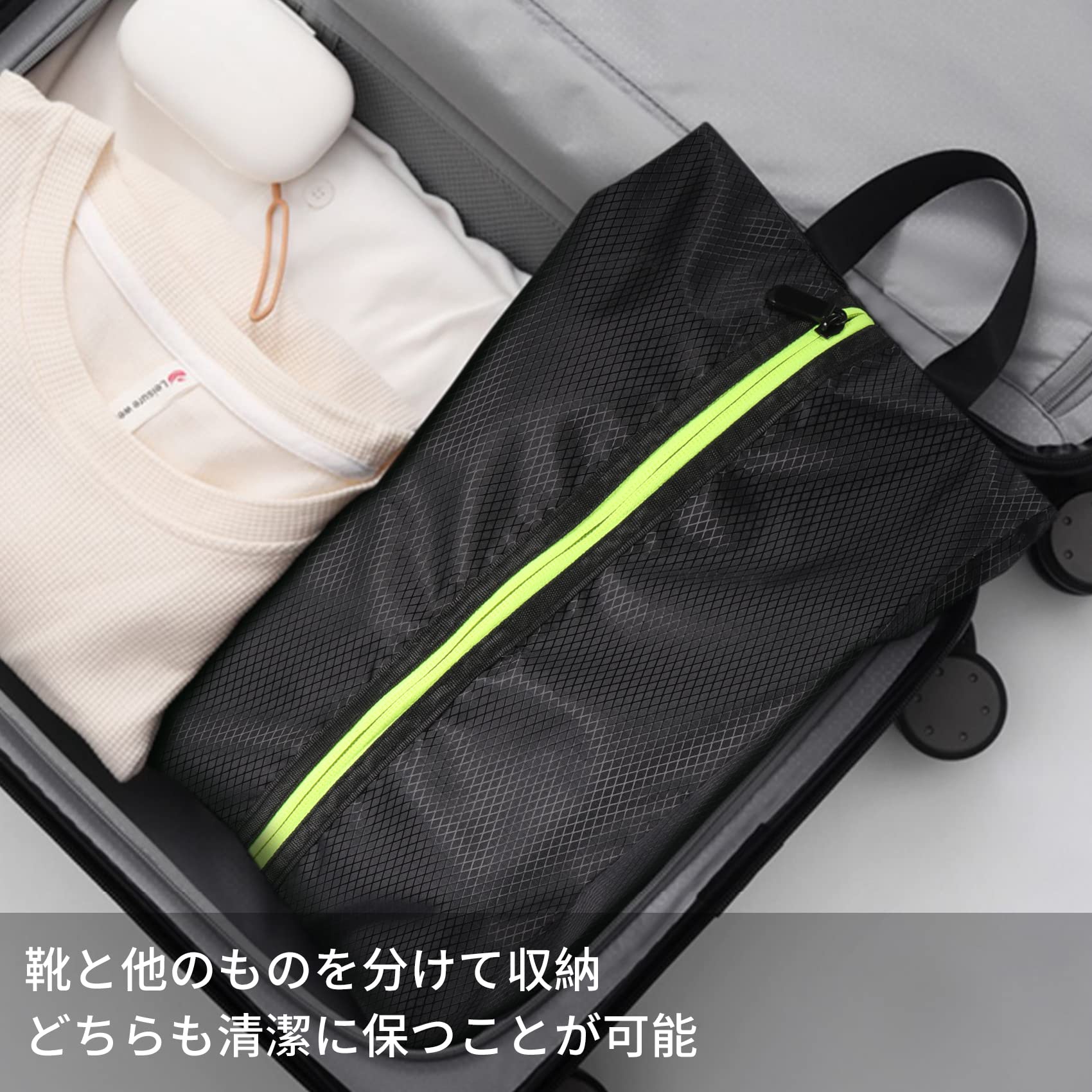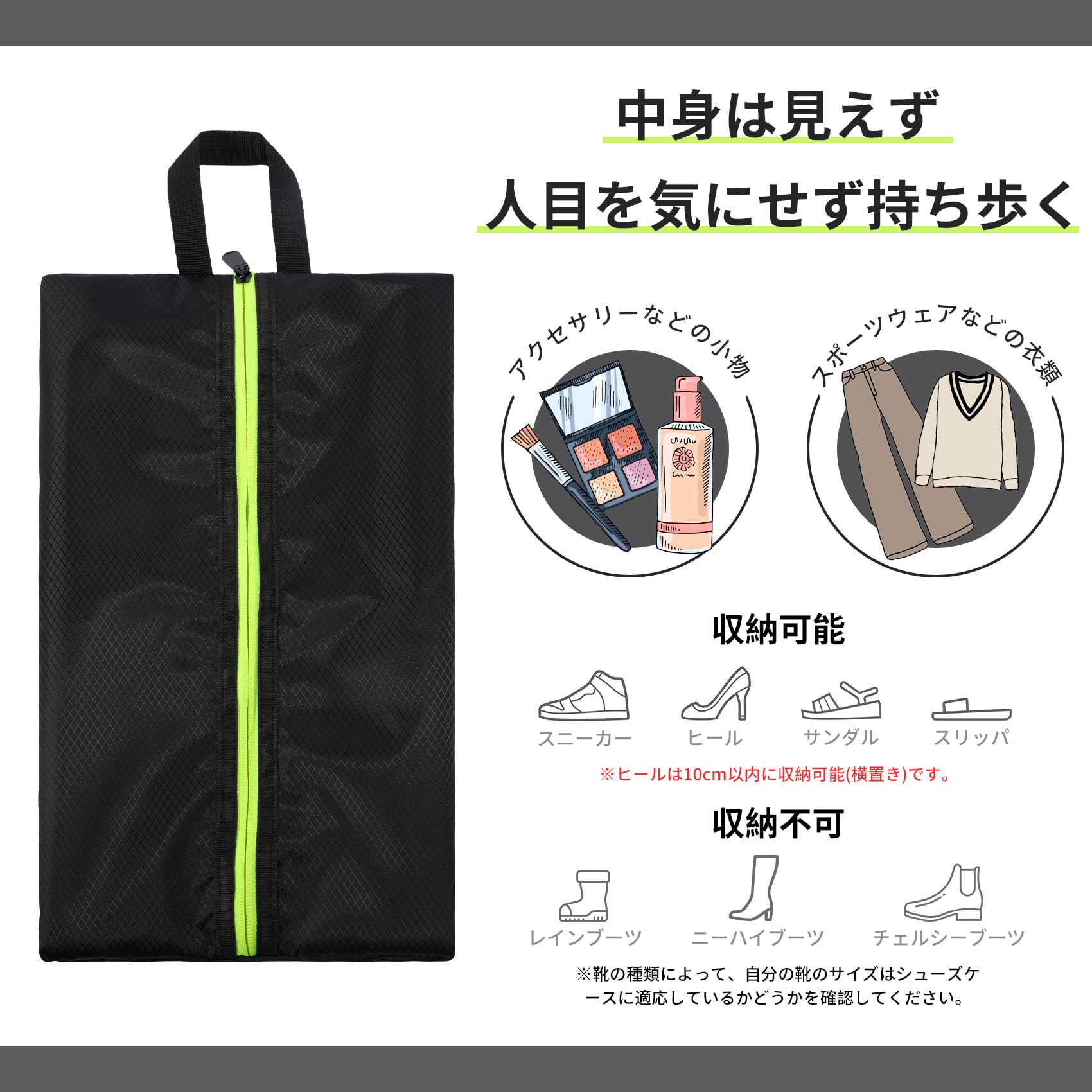 使い勝手:しゅーずけーすの中身が見えないので人目を気にせず持ち歩けます。表面が濡れたり汚れたりした場合は、布で軽く拭いてください。また水洗い可能なので、常に清潔な状態で使用可能です。