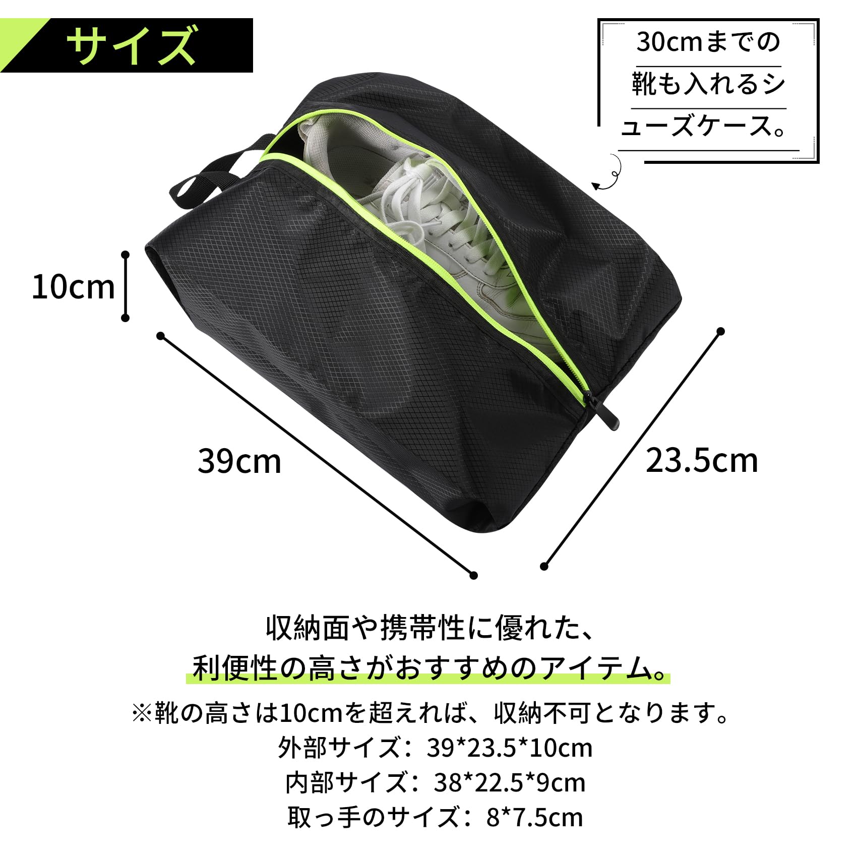 サイズ:シューズケースのサイズ約24x39x9cm。30cmまでの靴もゆったり収納可能です。バスケシューズ、スニーカー、ゴルフシューズ、革靴などの一般的な靴の大きさに合わせるサイズ、出し入れしやすいです。使わない時は、くるくる巻くだけでいつでもバッグに入れておけるサイズ。