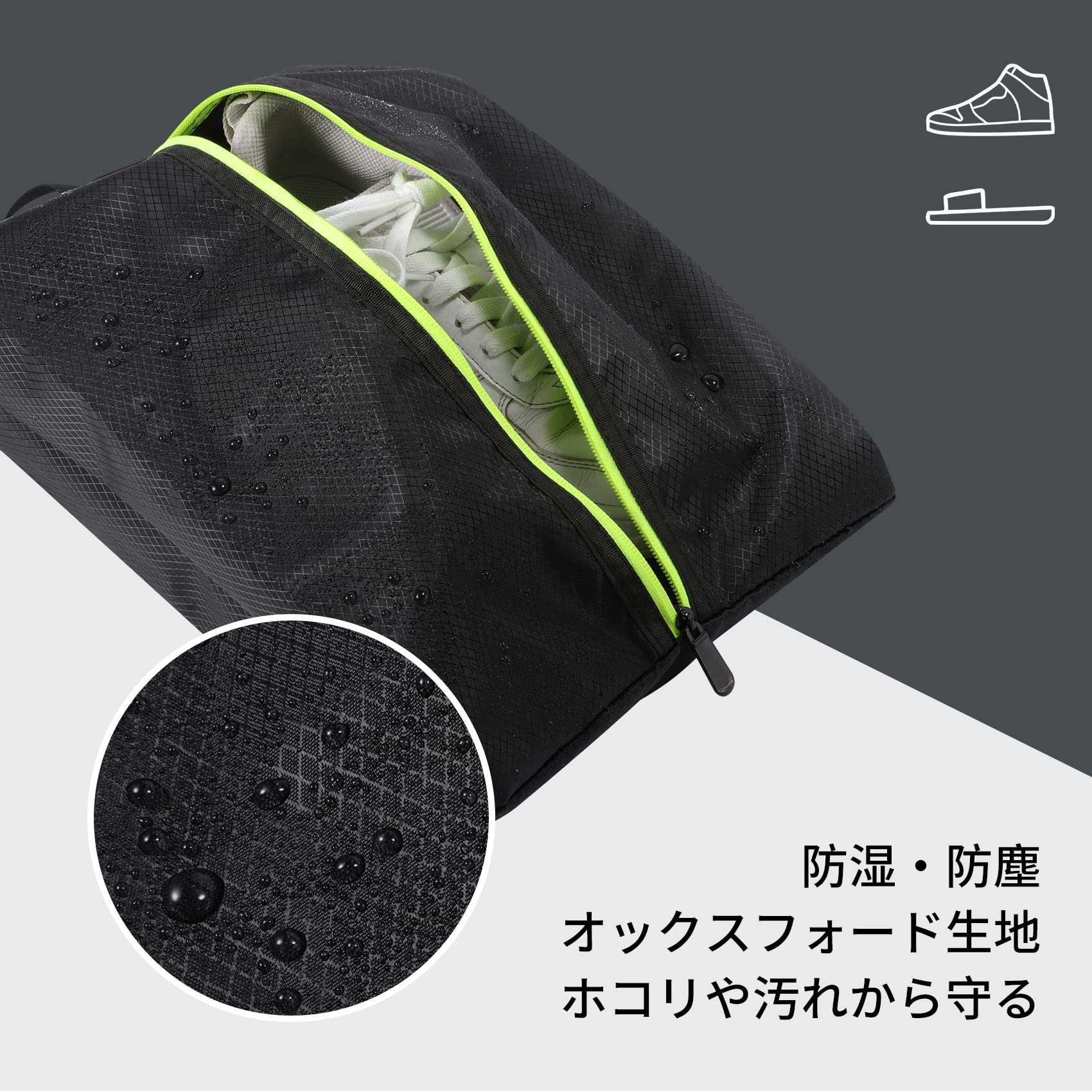防湿・防塵:旅行や出張など大切な靴の持ち運びに便利なシューズバッグです。男女問わず使いやすいデザインで、素材にはオックスフォード生地を採用し、通気性が高くて耐久性に優れており、靴をしっかり保護します。