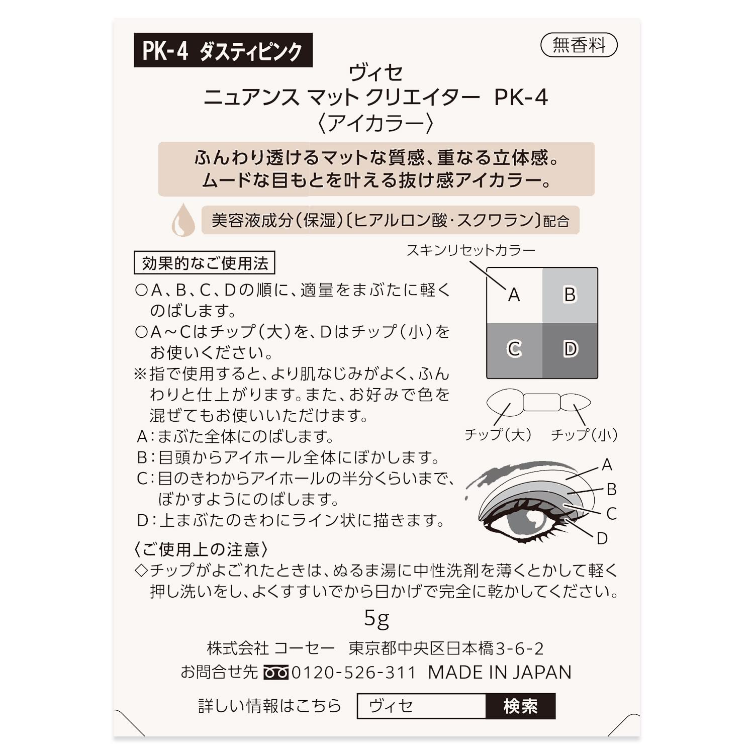 効果的なご使用法 : A、B、C、Dの順に、適量をまぶたに軽くのばします。A-Cはチップ (大) を、Dはチップ (小) をお使いください。指で使用すると、より肌なじみがよく、ふんわりと仕上がります。また、お好みで色を混ぜてもお使いいただけます。A : まぶた全体にのばします。B : 目頭からアイホール全体にぼかします。C : 目のきわからアイホールの半分くらいまで、ぼかすようにのばします。D : 上まぶたのきわにライン状に描きます。
