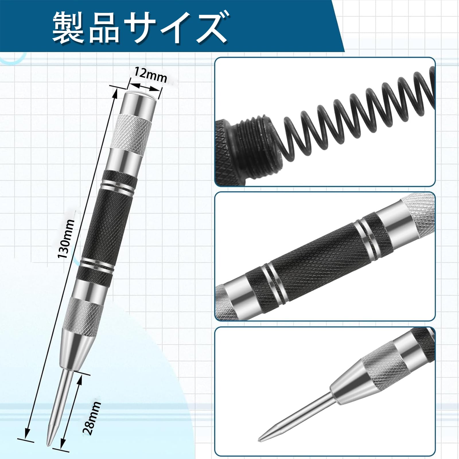 【商品内容】全長:130mm、自動ポンチ*2個、適合するパンチ針*2コンパクトなデザインで、持ち運びや交換がしやすい。