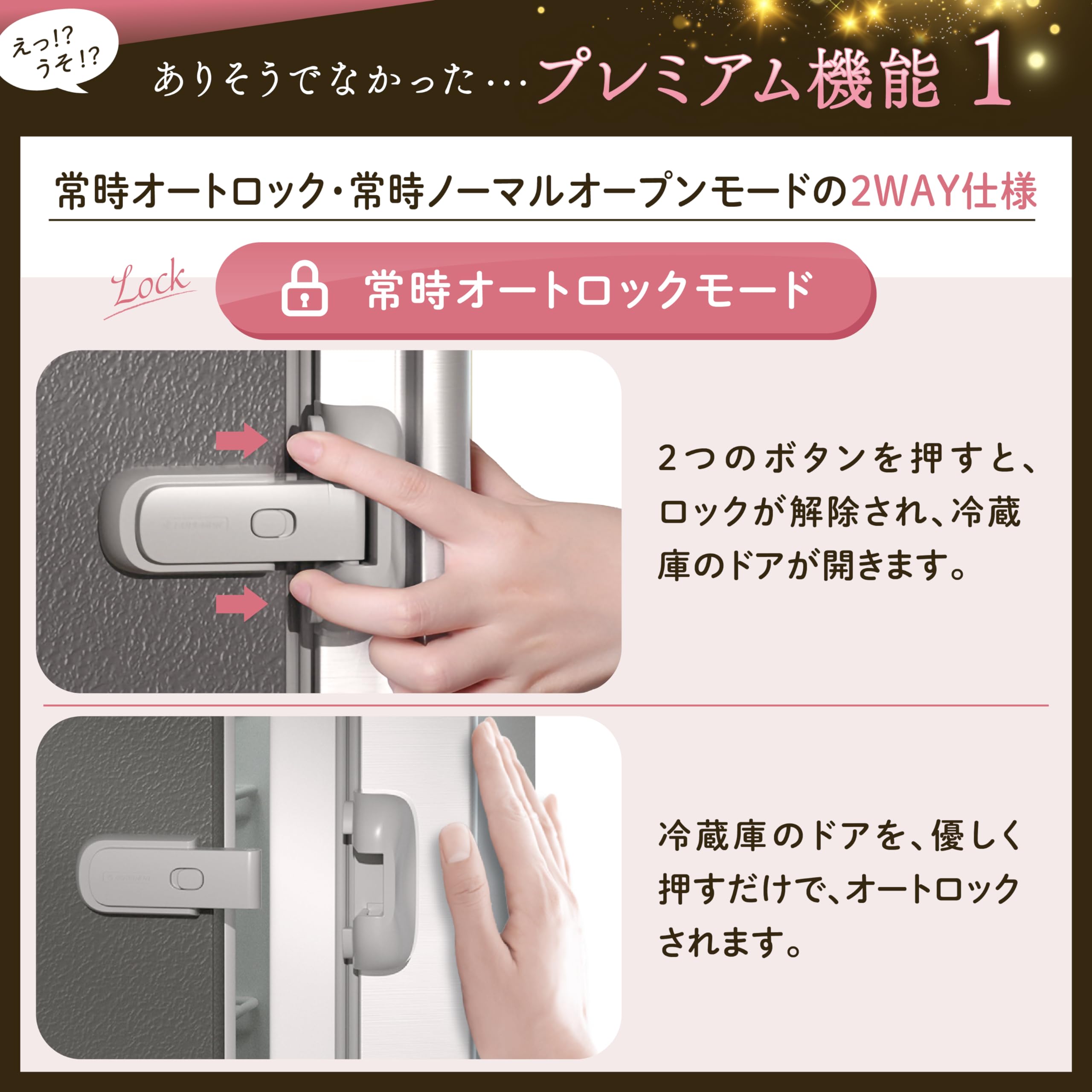 ?【常時オートロック機能】2か所のボタンを同時に押すとドアが開き、閉じると自動的にロックされます。【常時ノーマルオープン機能】冷蔵庫本体側に設置した冷蔵庫ロックキャッチの2つのラッチを同時に押し、中央のボタンを右にスライドさせると、ドアを閉めてもロックがかからず開閉できます。お子様がお昼寝中などに、スムーズに冷蔵庫の扉を開閉でき、ストレスなく家事ができます。