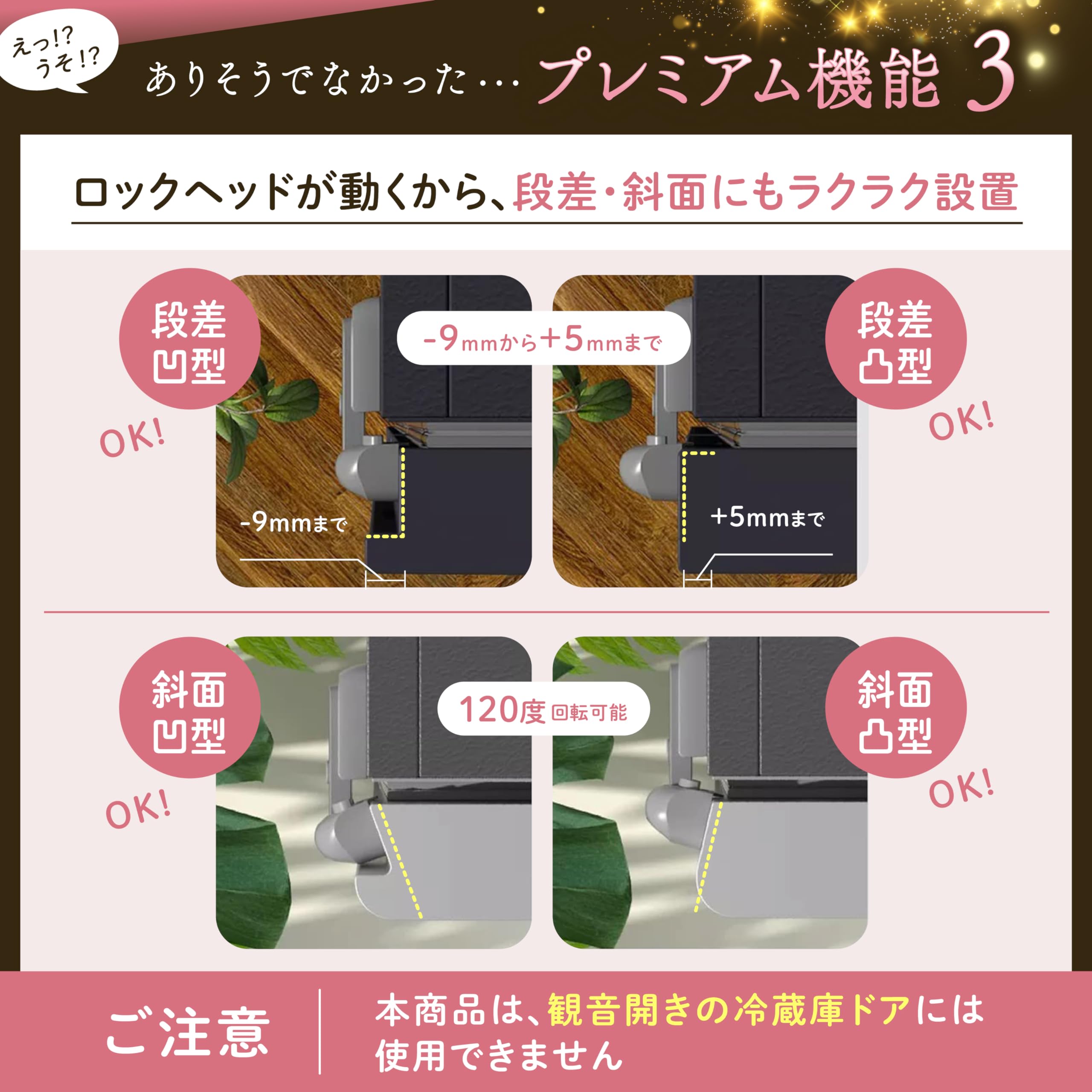 ?【段差にも設置可能】凹型ドアフレームの場合、−9㎜。凸型ドアフレームの場合、+5㎜まで設置可能。【斜面にも設置可能】冷蔵庫のドア側に設置するロックヘッドは、120度回転でき、斜面にも設置可能です。子供安全ロック、ベビーガード、引き出しロックとして、また、赤ちゃんやペットのいたずら防止、地震対策にも有効です。