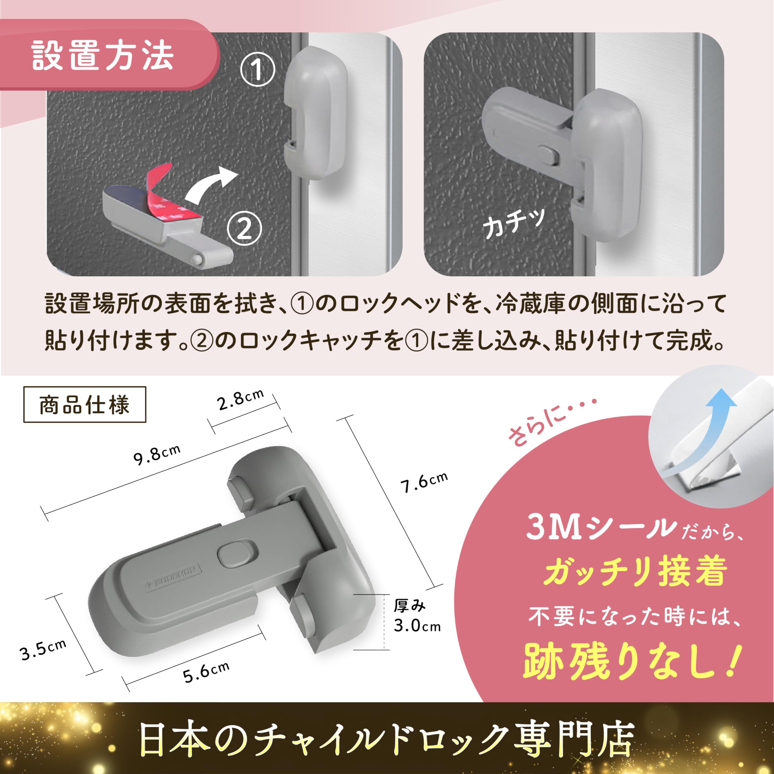 ?【3Мシールでラクラク設置】①取り付ける場所の表面を拭き、乾燥していることを確認します。?本体裏側2か所の3Мテープを剥がします。?コの字型の冷蔵庫ロックヘッドを、冷蔵庫ドアの側面に沿って貼り付けます。④棒状の冷蔵庫ロックキャッチを、冷蔵庫ロックヘッドに差し込み、設置完了です。