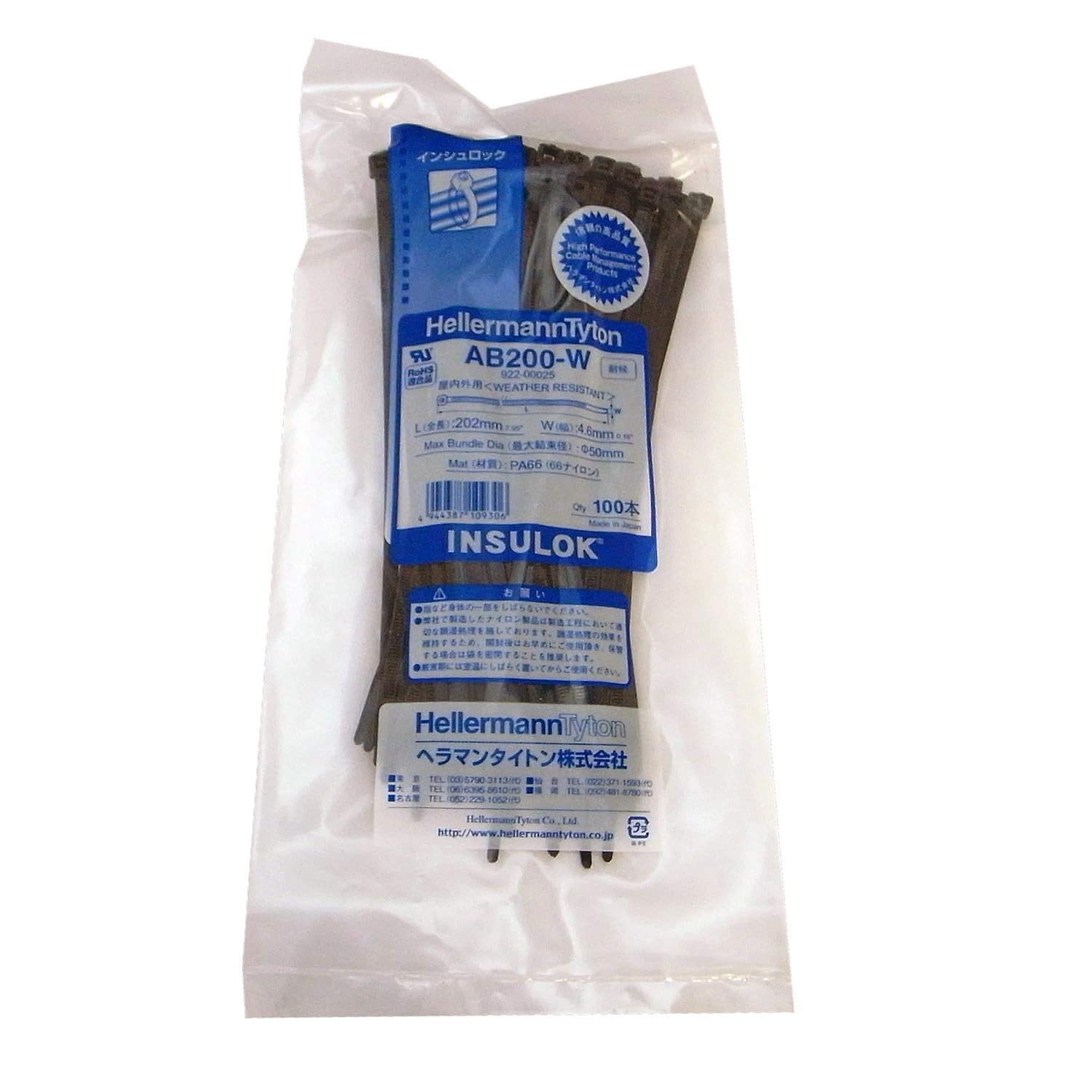 HellermannTyton ヘラマンタイトン 結束バンド インシュロック AB200-W 100本入 耐候・屋内外用グレード 黒