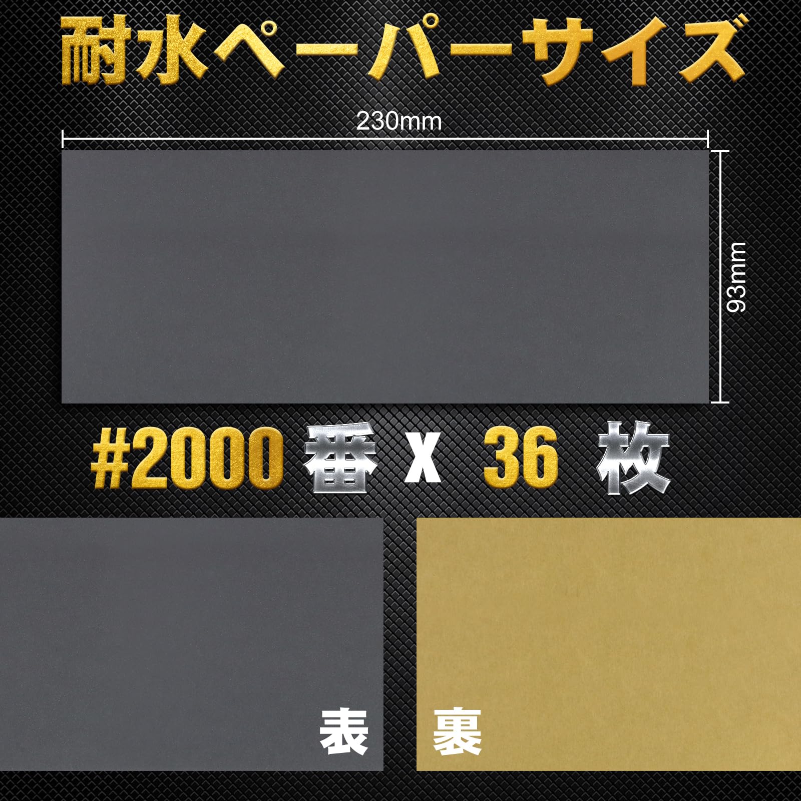 耐水ペーパー セット 2000番号、230mm×93mmのサンドペーパーが36枚入っており、数字が小さいほど表面が粗く、数字が大きいほど表面が細かくなります