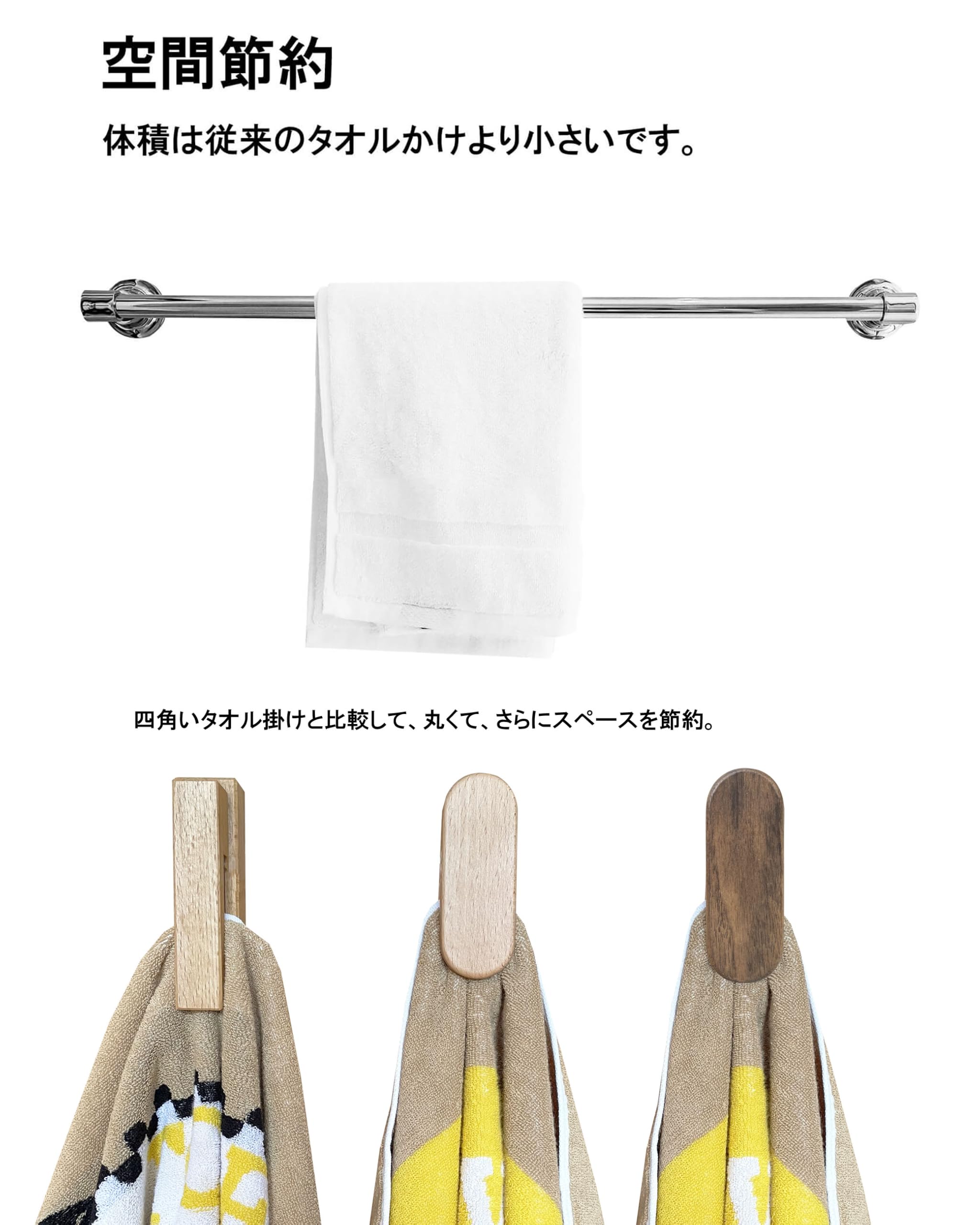 インテリアに馴染むナチュラルテイスト:発の人気商品である四角いタオル掛けからインスピレーションを受け、丸いタオル掛けとしてコンパクトかつ精巧な外観に再設計!従来の四角いタオル掛と比べ、約1.5倍のスペースを節約が可能。