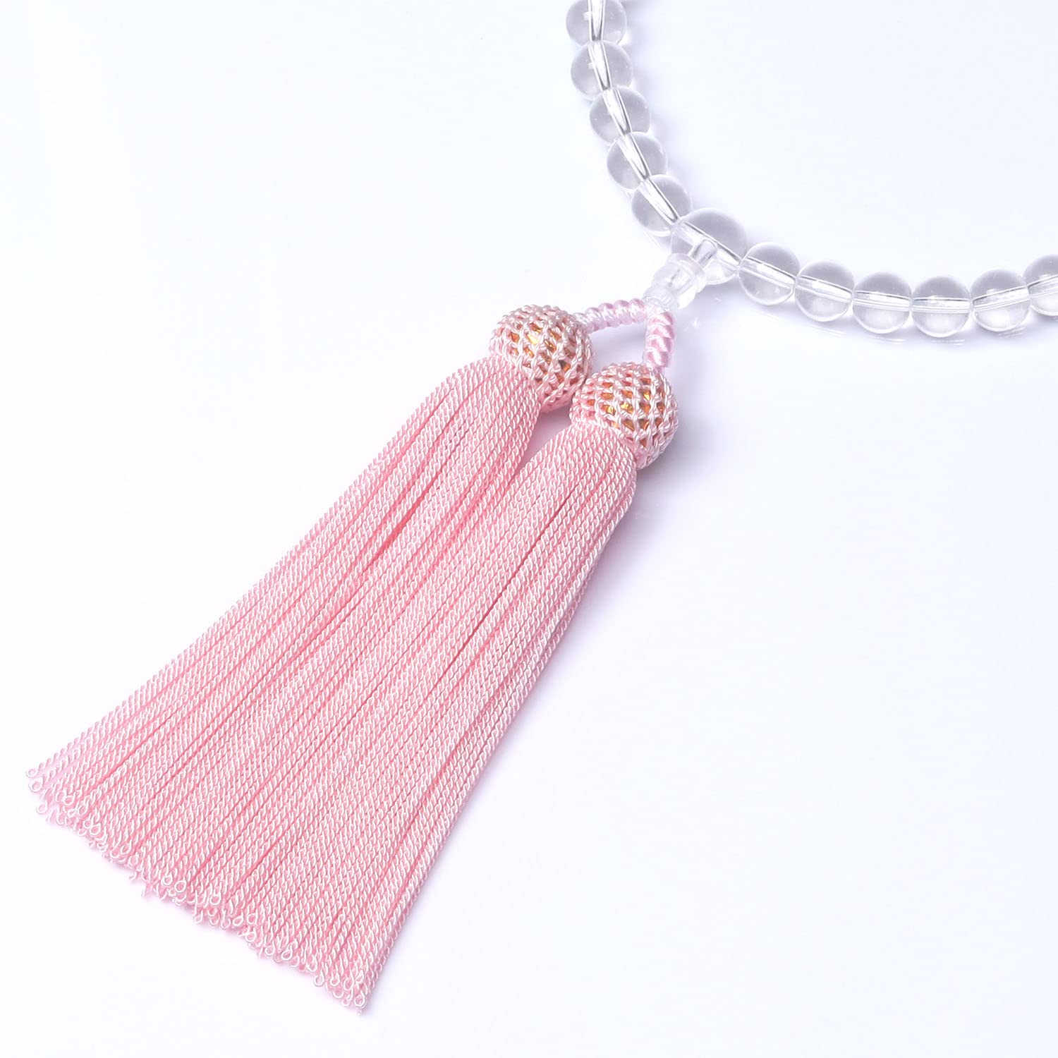 【落ち着いたピンク】色はピンクですが、落ち着いたピンクです。渋い数珠を嫌がる10代20代などの若い方に特におススメしますが、愛らしくエレガントな数珠をお望みの年配の方にももちろん最適です。