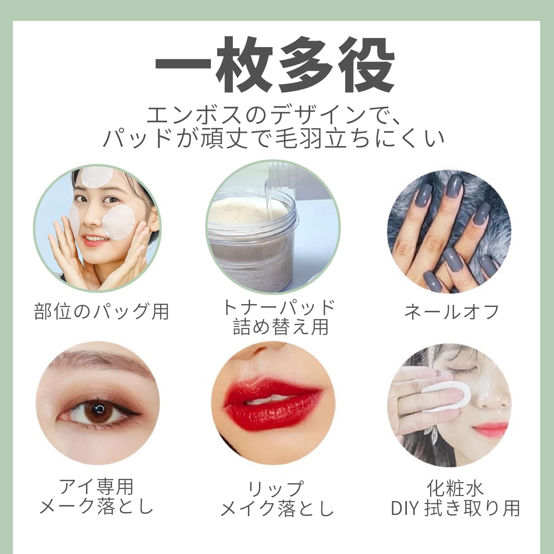 【一枚多用途】拭き取りパッドが色々な場合に活用しています。メーク落としシート、コットン拭き取り用、化粧水用コットン、ネールオフ用コットンなどとして利用できます。