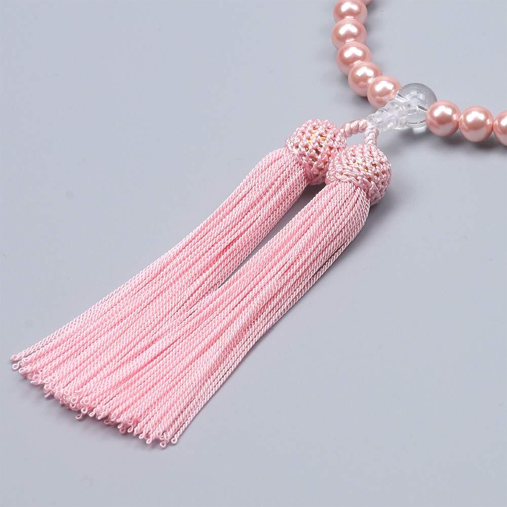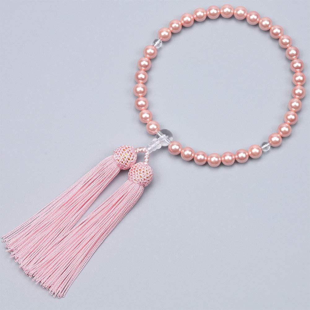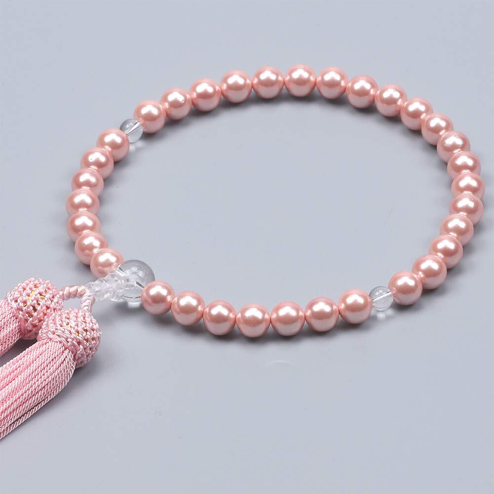 主玉:ピンク貝パール8mm、天玉:本水晶6mm 親玉:本水晶10mm 頭付房(ピンク)