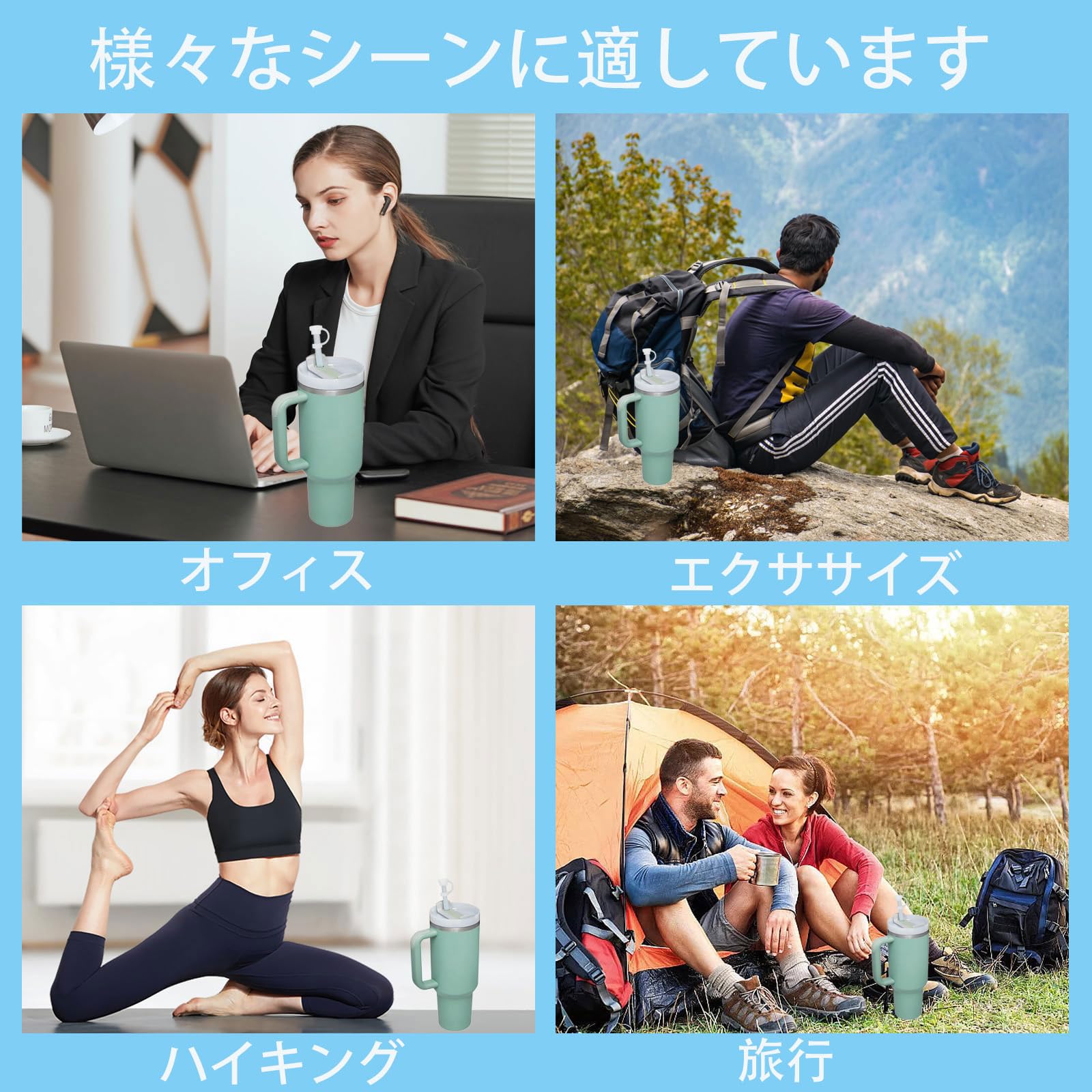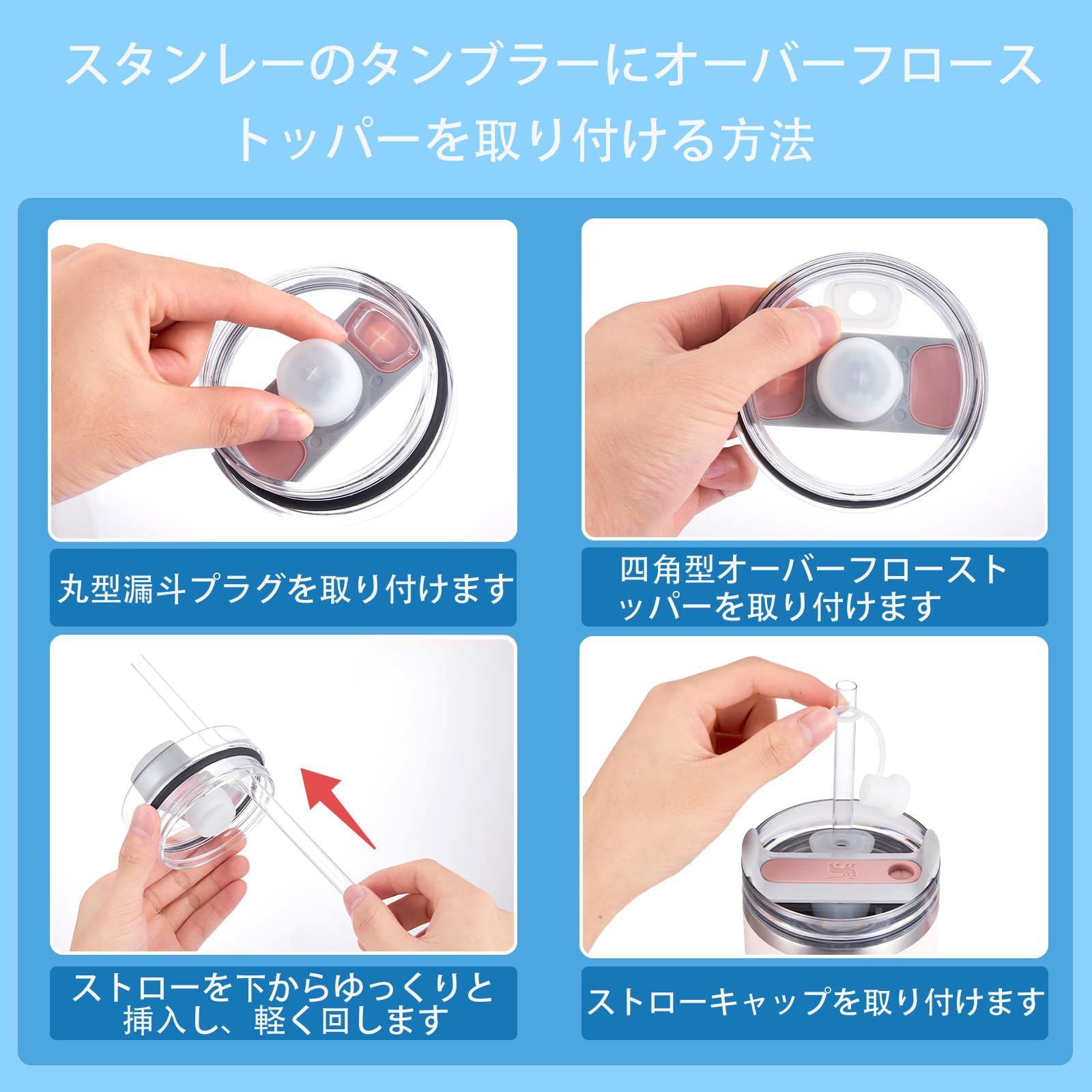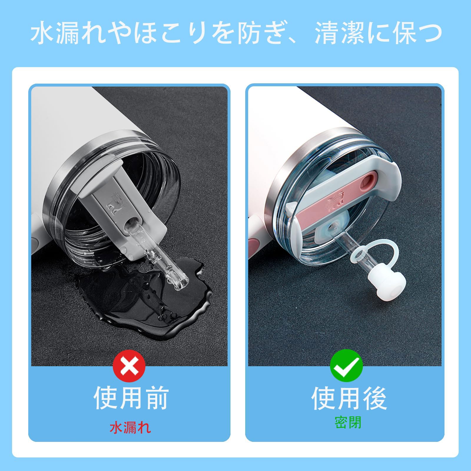 【パッケージ内容】:ストローカバーキャップ ×2、四角型こぼれ防止ストッパー ×2、丸型漏れ防止ストッパー ×2。取り付け・取り外しも簡単で、お手入れもラクラクです。直径10mm未満のストローに対応しています。ほとんどのストローに対応しており、より快適に飲むことができます。