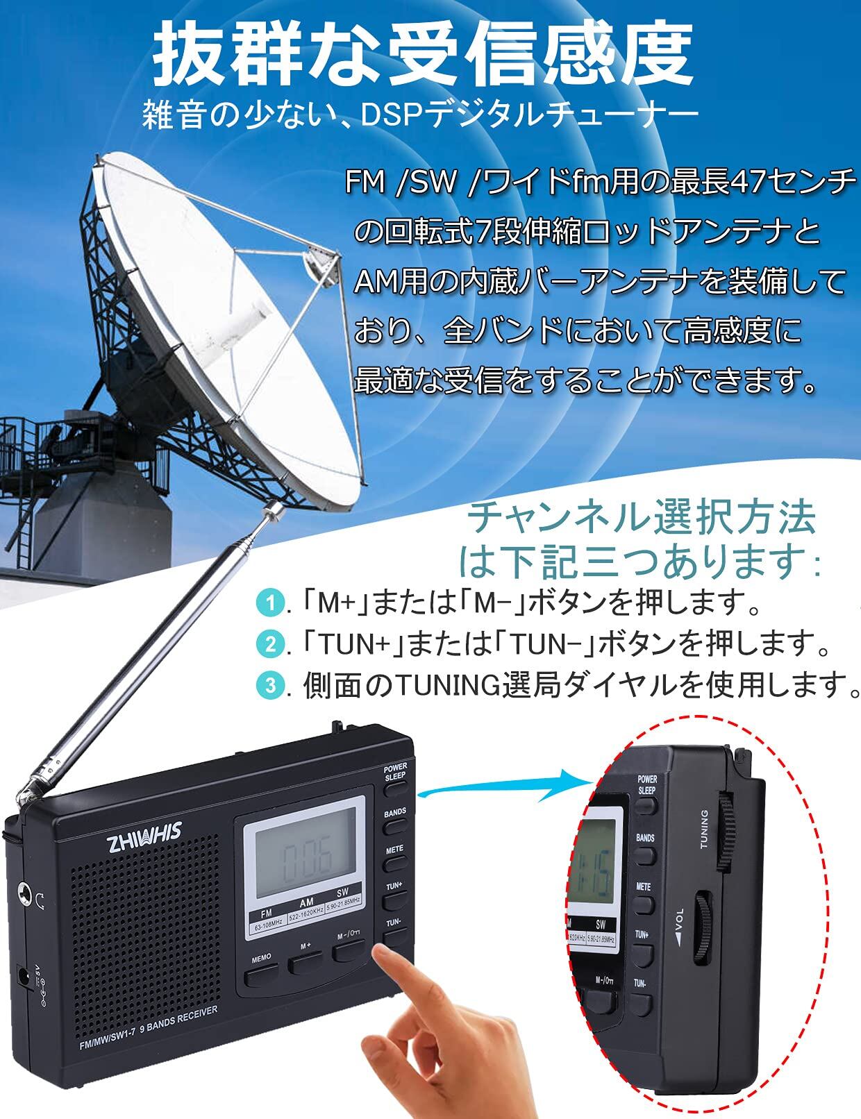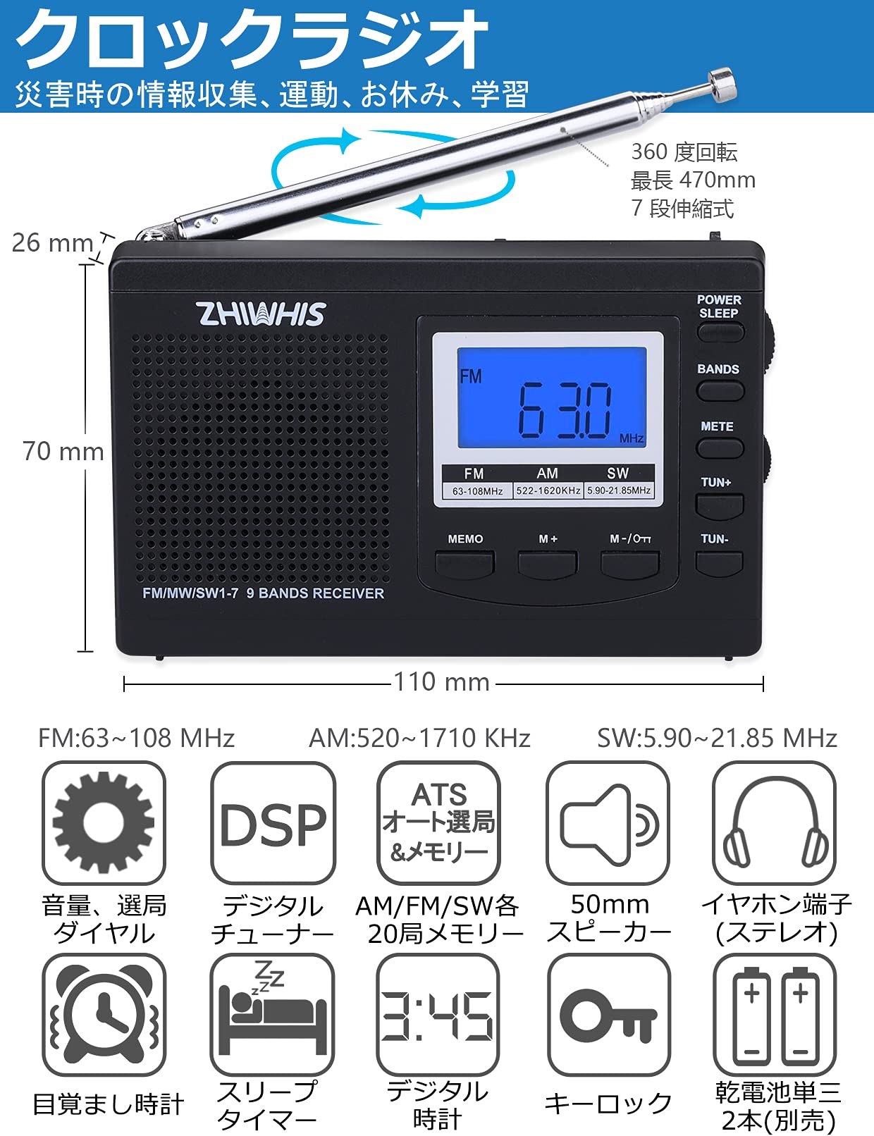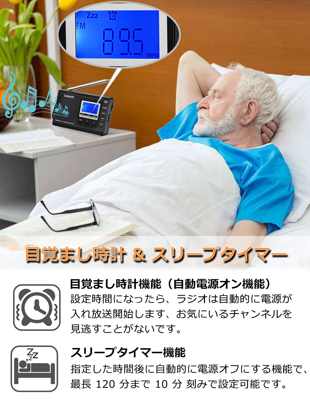 ZHIWHIS ラジオ 小型ポータブル FM/AM/SW ワイドfm対応 クロック防災ラジオ 電池式 タイマー/目覚まし時計/デジタル時計/キーロック/プリセット機能付き 横置き型 携帯 学習 災害用 日本語取説&書付き